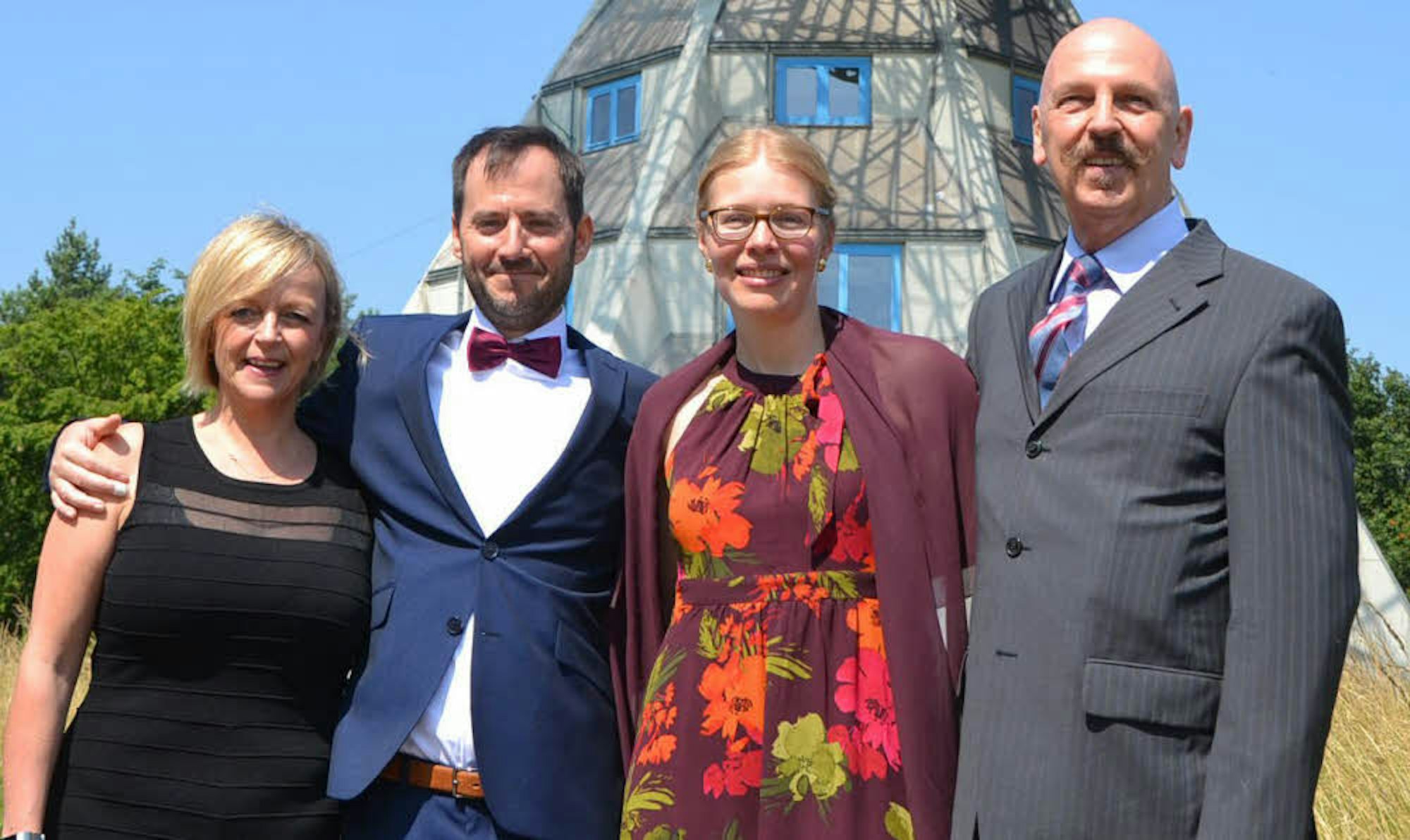 Die Hochzeitsgäste, die in den technisch-rustikal anmutenden Räumlichkeiten am Sektempfang teilnahmen, schienen diese Ansicht zu teilen. Im Überschwang der Gefühle fielen sie dem Brautpaar immer wieder in die Arme, gratulierten zu ihrem großen Tag und genossen bei strahlendem Sonnenschein den Ausblick auf die Natur rund um den Astropeiler Stockert.