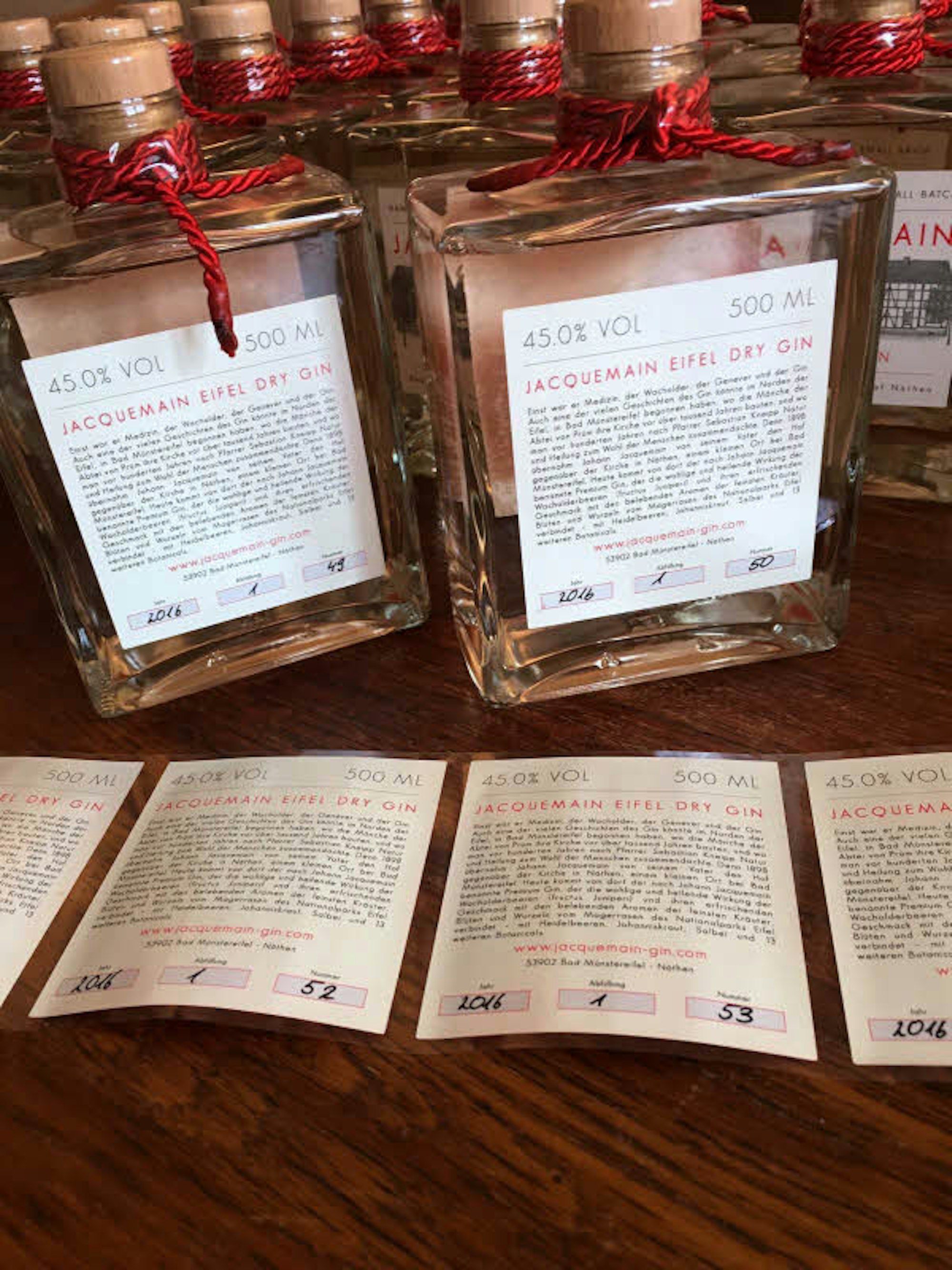 Nach der mehrwöchigen Lagerung in historischen Kupferblasen wandert Honnefelders „Jacquemain“ zur Abfüllung dann auf den Johannshof. „Das ist alles tatsächlich Handarbeit“, so Matthieu Honnefelder. In die eigens entworfenen, eckigen Flaschen werde der hochprozentige Brand in speziell präparierten Räumlichkeiten gefüllt, da man Hygiene-Auflagen zu beachten habe. Die Etiketten würden im Wohnzimmer der Familie aufgeklebt und sorgfältig mit Datum und Nummer versehen. Neben der Ahnengalerie im Esszimmer käme schließlich die rote Kordel um den Flaschenhals. „Ohne die Hilfe von Familie und Freunden ist das nicht zu schaffen“, erläutert der Unternehmer.