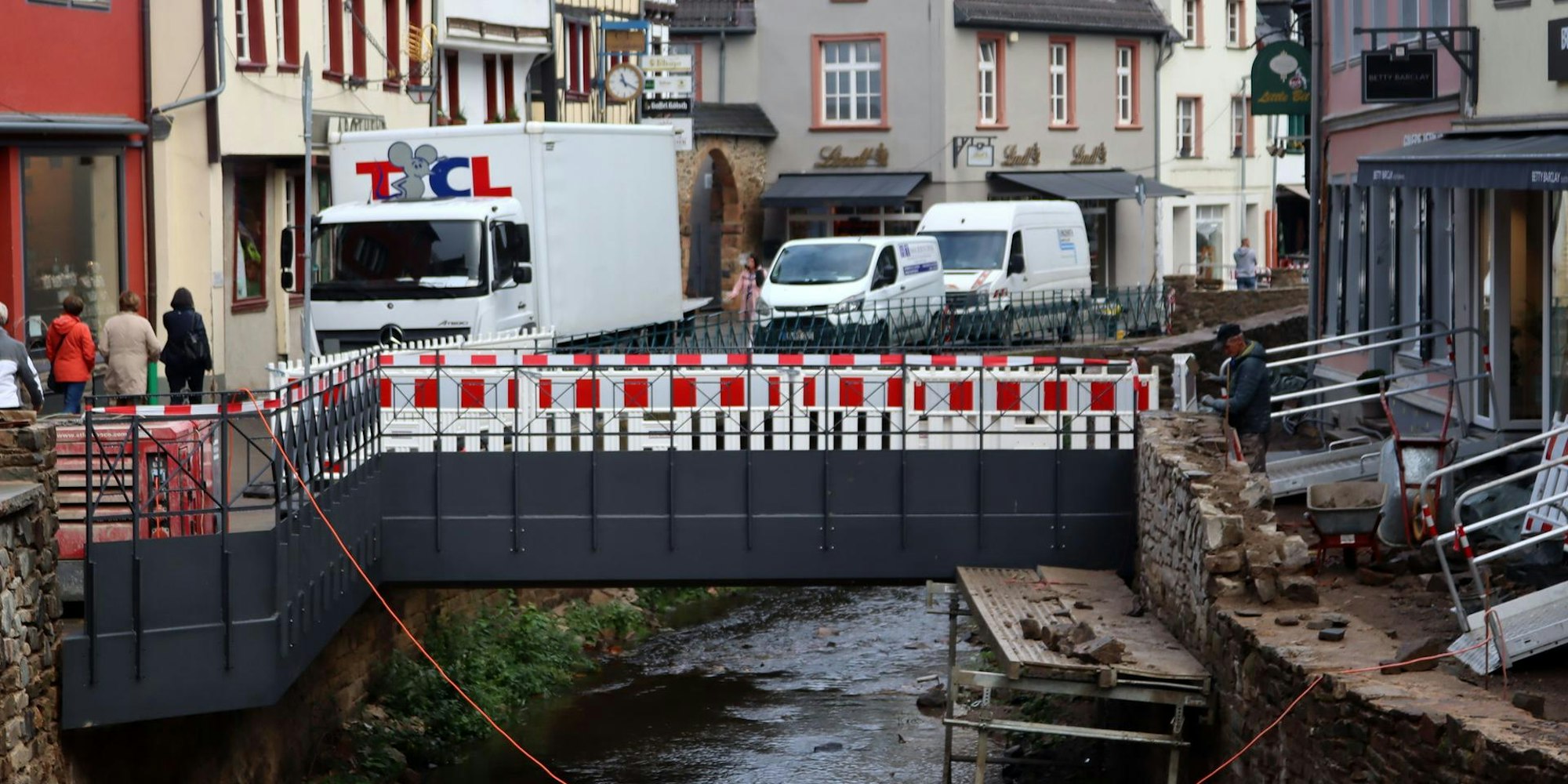 Die zerstörten Erftmauern in der Kernstadt seien zu 95 Prozent wiederaufgebaut, auch die Abdeckplatten werden als Abschluss bereits verlegt. Das neue Geländer mit integriertem Hochwasserschutz entlang der Erft ist ebenfalls installiert.