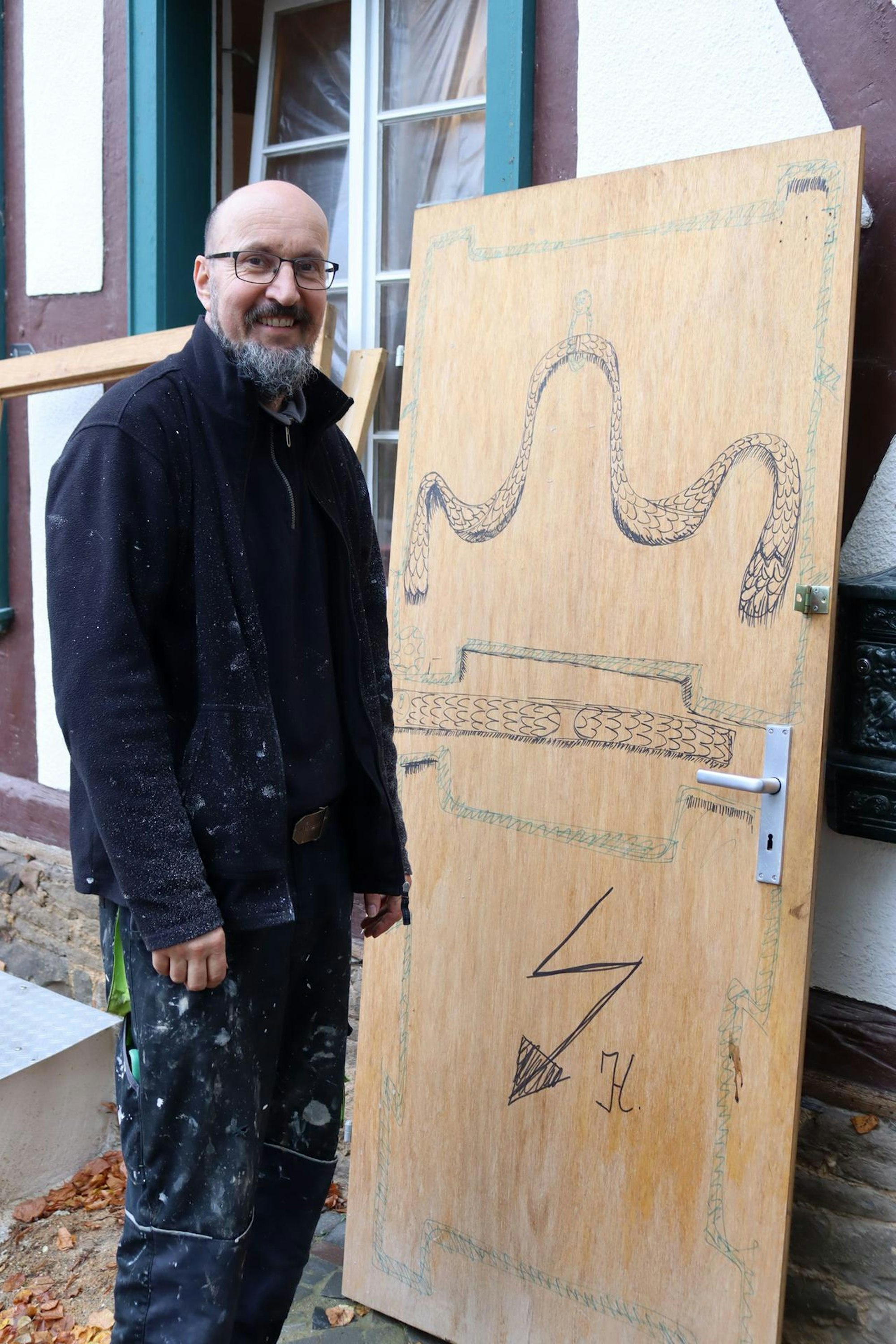 Bad Münstereifel – Endlich! Die Zeit des Provisoriums ist für Bernd und Jeannette Bünger vorbei. Zwar hatte die dünne Übergangs-Haustür durchaus ihren eigenen Charme, weil die Nachbarn die Ornamente der von der Flut weggespülten Originaltür mit Stiften darauf gezeichnet hatten. Doch seit Dienstag hat das Ehepaar, das in Bad Münstereifel unter der Bezeichnung „der Torwächter und des Torwächters Weib“ für seine Stadtführungen bekannt ist, wieder eine richtige Haustür. Und was für eine!