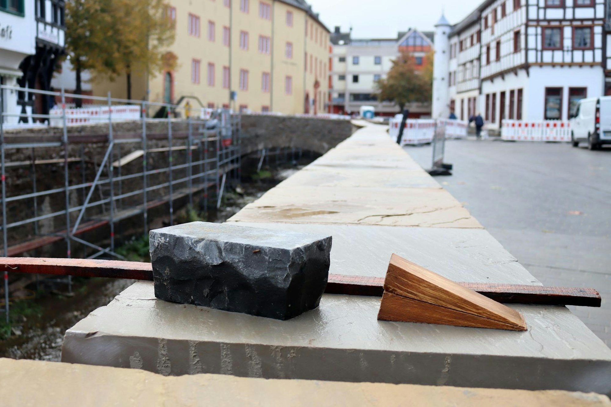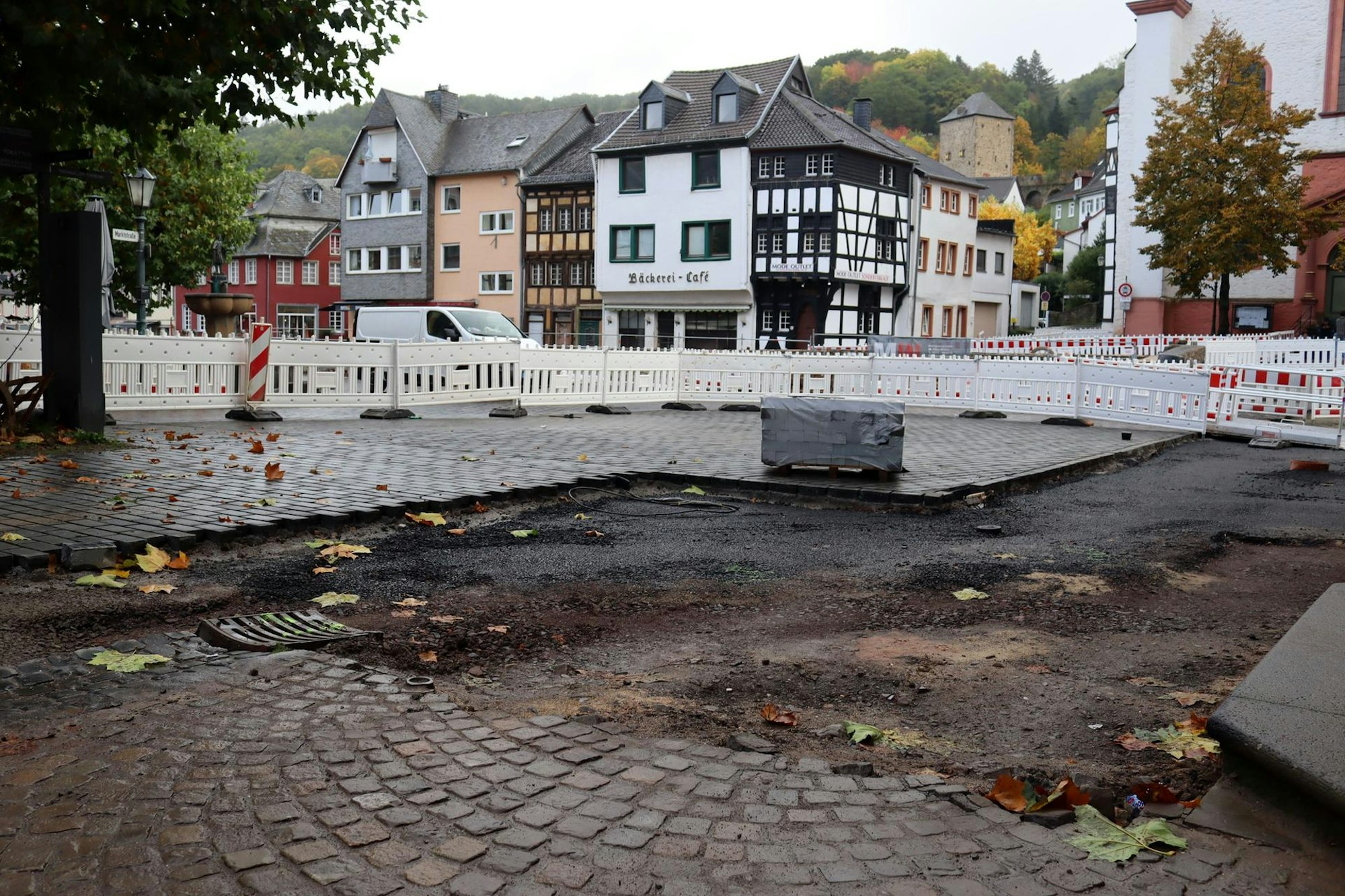 Wie immer, wenn man sich mit dem Wiederaufbau in Bad Münstereifel befasst, muss man konstatieren: Es hat sich viel getan in der Stadt. Die „Pflasterlücke“ am Markt, wo Orchheimer, Werther und Markstraße zusammentreffen, wird immer kleiner. „In diesem Abschnitt ist die Verkehrsführung eine große Herausforderung, da es sich sowohl um einen Kreuzungsbereich handelt als auch in diesem Bereich zwei Brücken anschließen“, formuliert es Ralf Wassong, technischer Betriebsleiter der Stadtwerke. Die Arbeiten dort nehmen mehr Zeit in Anspruch, so Wassongs Erklärung, weil nicht gleichzeitig an beiden Brücken mit Unterbau und Pflasterung begonnen werden könne. Außerdem benötige das neu verlegte Pflaster eine gewisse Ruhezeit, bevor es belastet wird.