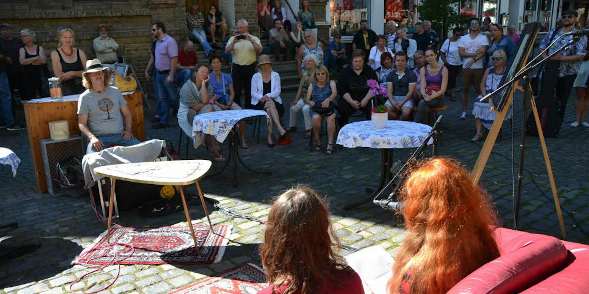 Anfangs wunderten sich Anwohner und Gäste noch über das rote Ledersofa inmitten der Bad Münstereifeler Innenstadt. Mittlerweile hat sich jedoch herumgesprochen, dass sich ein kurzer Stopp vor diesem Sitzmöbel durchaus auszahlen kann. Ob mit Anmeldung oder völlig spontan war es allen Besuchern möglich, mit einem eigenen kleinen Gedicht- oder Liederbeitrag aufzutreten. Am Sonntag versammelten sich nun bereits zum vierten Mal Poeten und Liedermacher auf der Werther Straße und zogen die Aufmerksamkeit vieler Zuschauer auf sich – zum Beispiel Jana Esser.