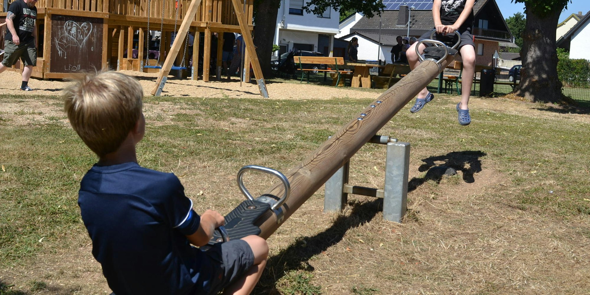 Bad Münstereifel-Kirspenich – Völlig vermodert und einsturzgefährdet zählten die Spielgeräte auf dem Kirspenicher Spielplatz in der Bachstraße zu den zahlreichen Verwüstungen, die die Hochwasserkatastrophe im Juli des vergangenen Jahres in dem Bad Münstereifeler Vorort hinterlassen hatte. Am Samstag, 14 Monate nach der verheerenden Flut, konnten die Anwohner ihrem Nachwuchs endlich wieder einen neuen Ort präsentieren, an dem sie sich nach Herzenslust austoben können.