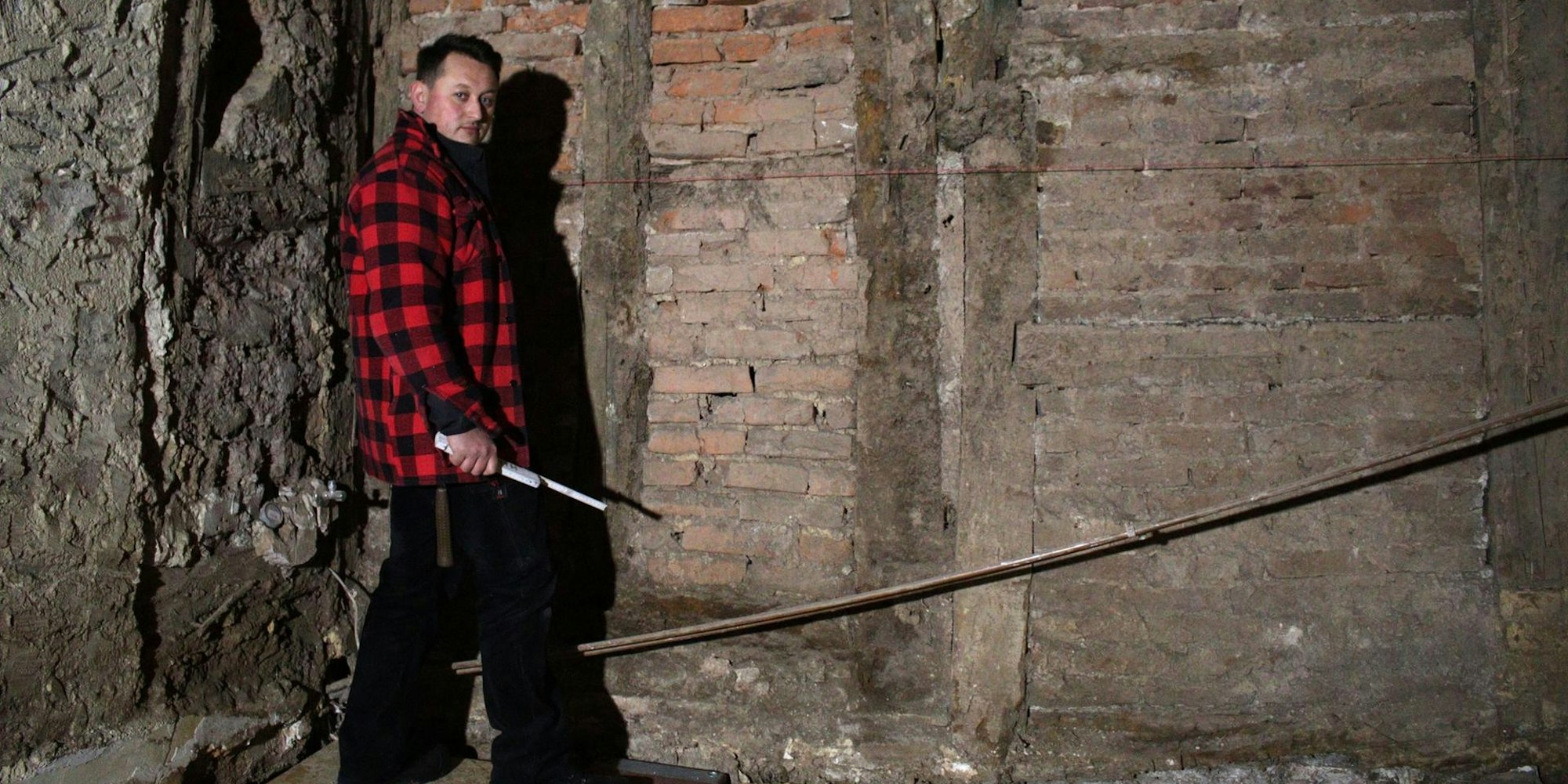 Im Haus in der Orchheimer Straße hat er sich notdürftig ein paar Holzplatten und -planken über die nicht unbedingt vertrauensvoll ausschauenden Balken gelegt. Darunter ist der Keller sichtbar. Zugegeben: Aufrecht stehen kann man in dem vermutlich nicht.