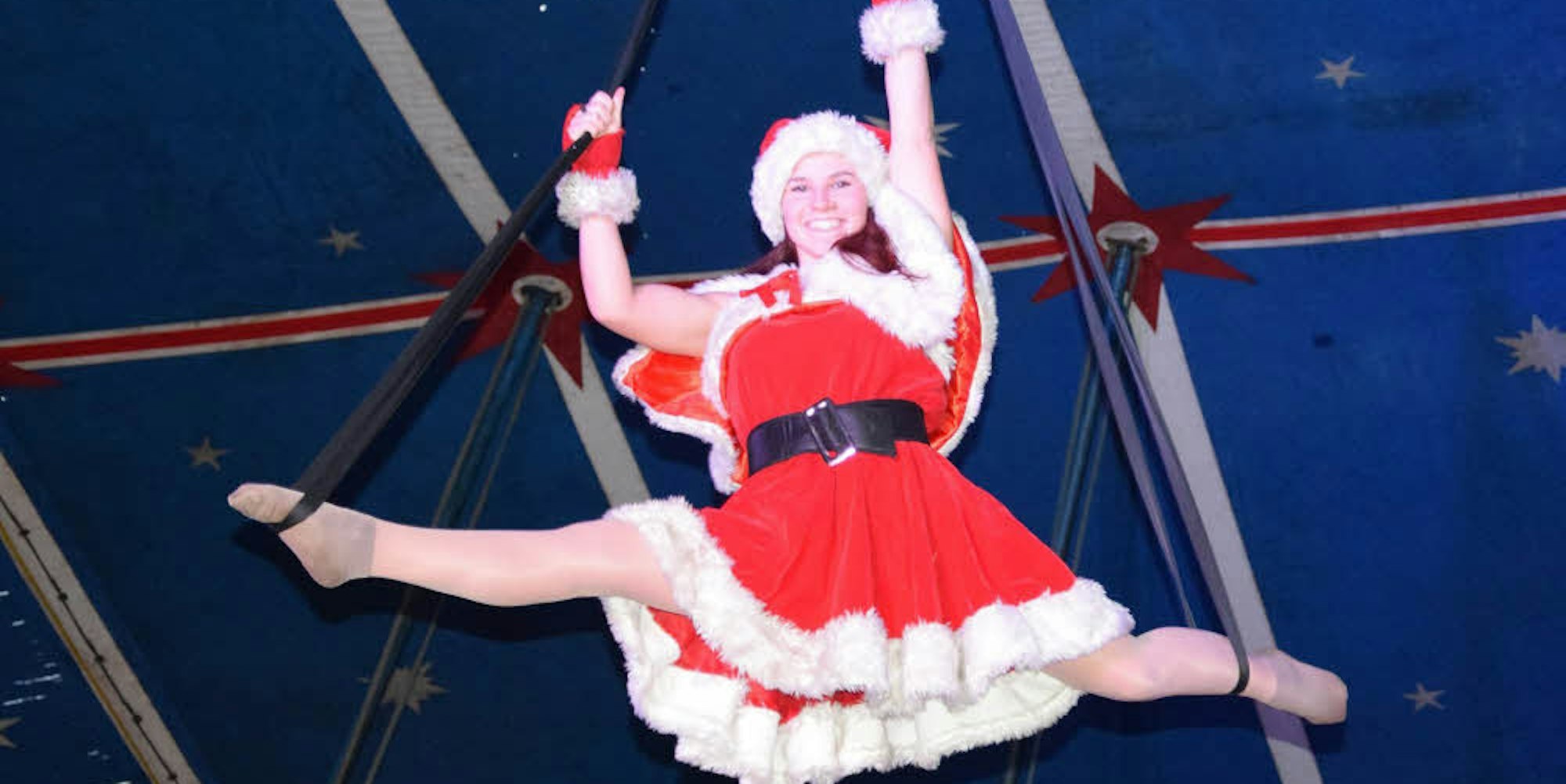 Als fliegender Weihnachtsmann zeigt Luftakrobatin Madelain ihre Vorführung unter der Kuppel des Zirkuszelts.