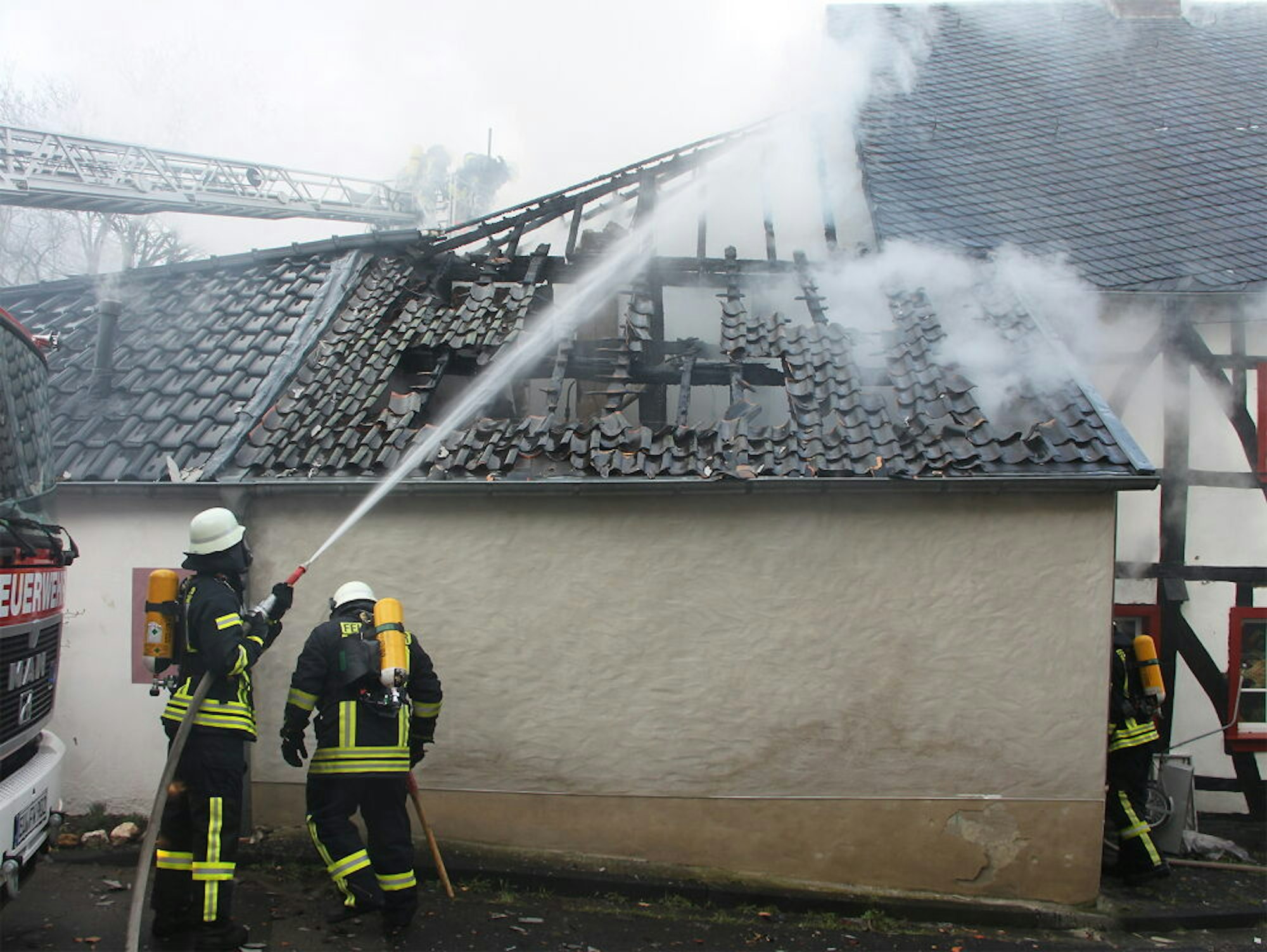 „Es war zuerst unklar, ob noch jemand in dem alten Haus war oder nicht“, so Heller. Eine erste Erkundung des Fachwerkhauses durch Atemschutz-Teams war zwar ergebnislos, doch den Bereich des brennenden Dachstuhls konnten die Retter zu diesem Zeitpunkt noch nicht sichten. Er war komplett verqualmt.