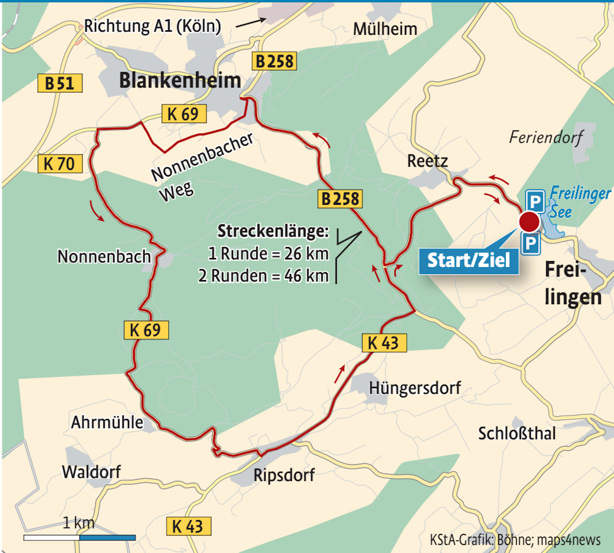Höhepunkt wird der „Col de Ripsdorf“ der sich in Serpentinen hinauf in den Ort schlängelt. Nach der rauschenden Abfahrt ins Ahrtal geht es dann wieder hinauf zum Freilinger See. „Das wird eine wahre Herausforderung“, urteilt der Fachmann. Der abschließende Lauf führt dann rund um den Stausee.