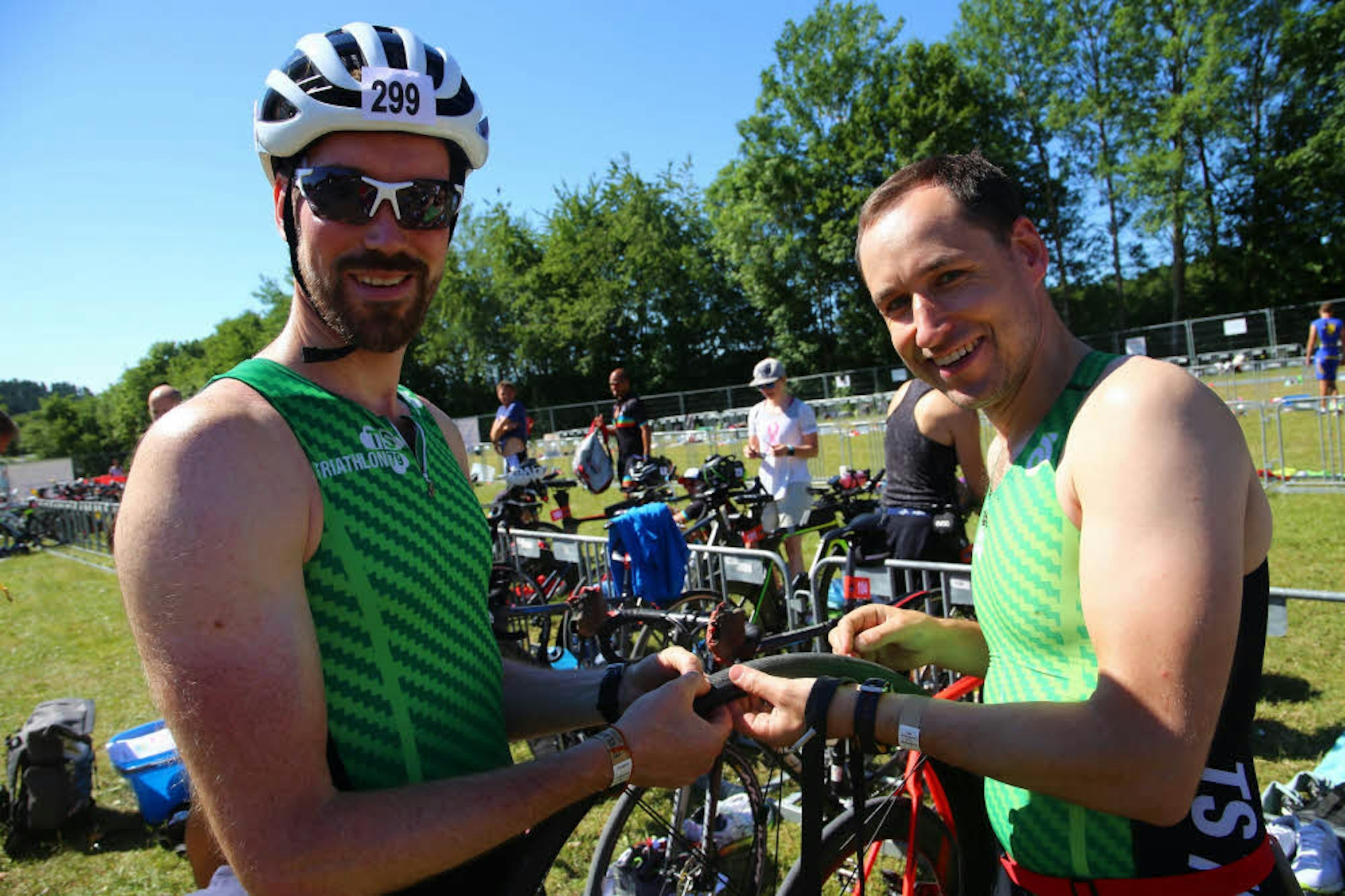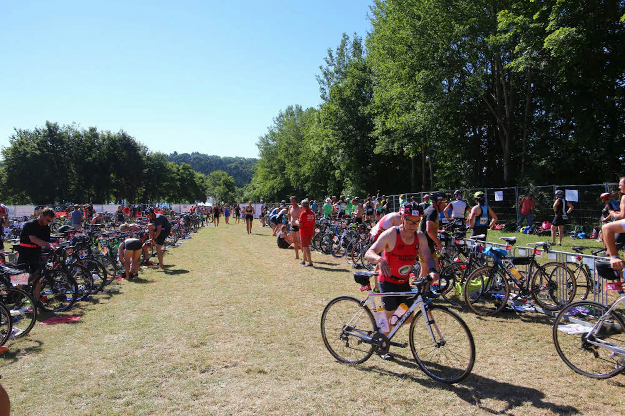 Aufregend war es immer in den Wechselzonen – besonders für die Teilnehmer der Staffel. Sie mussten sich nämlich den Zeitnahmechip vom Fußknöchel schnallen. Für die Einzelwettbewerber gab es eine andere Herausforderung: Für sie galt es, in Windeseile das richtige Fahrrad zu finden.