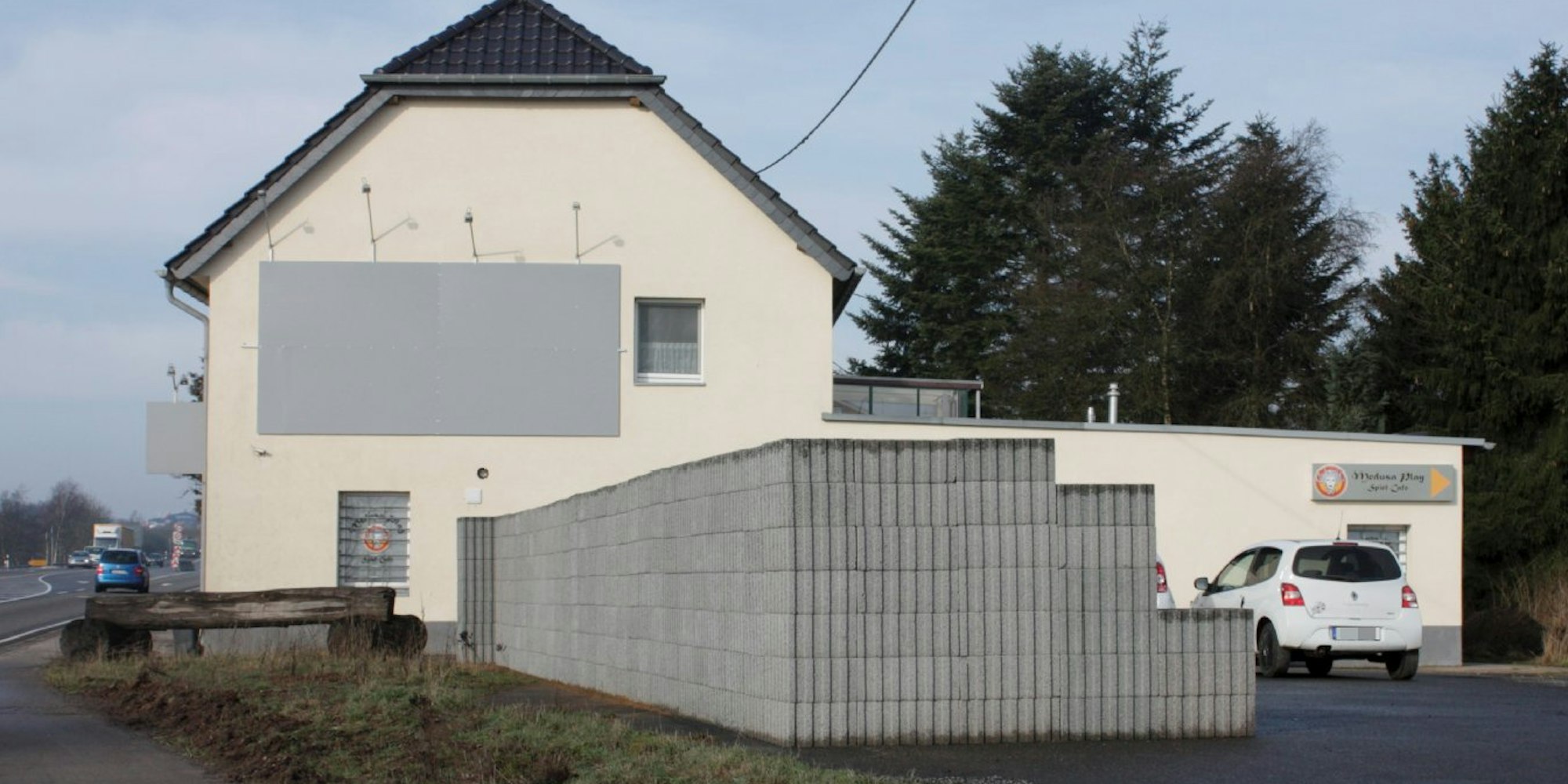 Gleichzeitig wuchs am Rand des benachbarten Parkplatzes eine große Mauer empor. Von der Bundesstraße aus kann man nun nicht mehr sehen, welche Autos auf dem Parkplatz stehen.