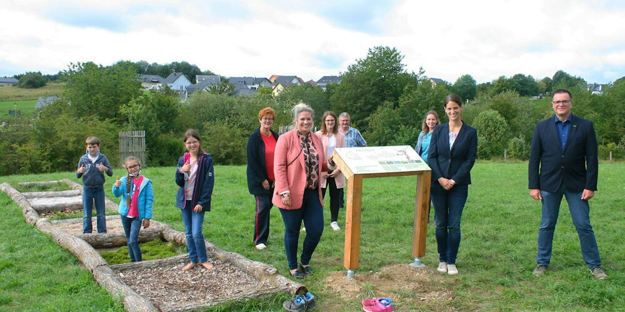 Der Rundweg beginnt auf der Wildniswiese der Grundschule, wo die Schüler schon bisher als kleine Imker drei Bienenstöcke betreuen und ihren Schulhonig ernten. Auch Luca und Swenja (neun Jahre alt) und Karina (zehn Jahre) aus der 3. Klasse waren schon in den weißen Schutzanzügen im Einsatz. Jetzt stehen sie mit nackten Füßen auf dem Barfußpfad, der neunten und letzten Station des Rundkurses, der auch wieder auf der Wildwiese endet.