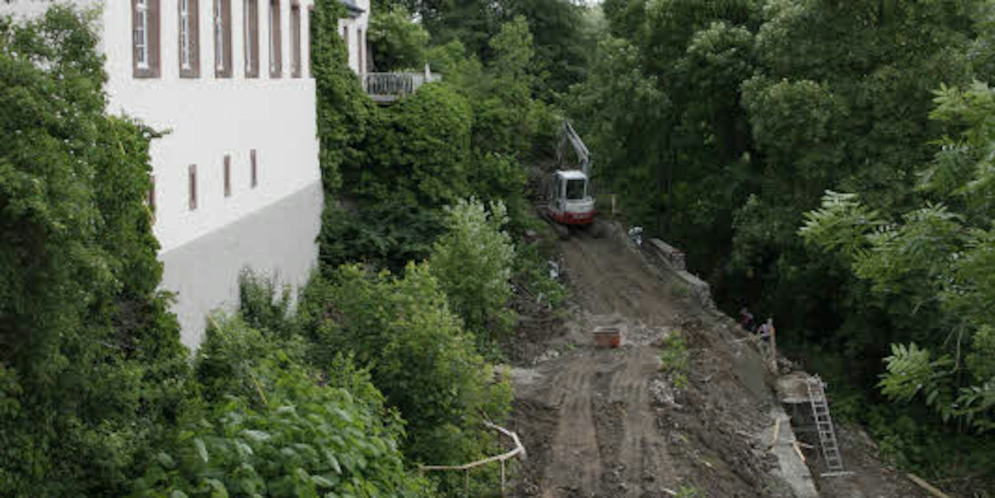„Auf alten Bildern ist die gesamte Burganlage, die hoch über Blankenheim liegt, komplett zu erkennen“, berichtet Frieder Vüllers, der Eigentümer der Vorburg. Auf diesen Darstellungen sieht man auch eine Stützmauer, die sich über den gesamten Fuß der Anlage erstreckt. Irgendwann im vergangenen Jahrhundert, vermutlich nach dem Zweiten Weltkrieg, ist sie nach und nach eingestürzt.