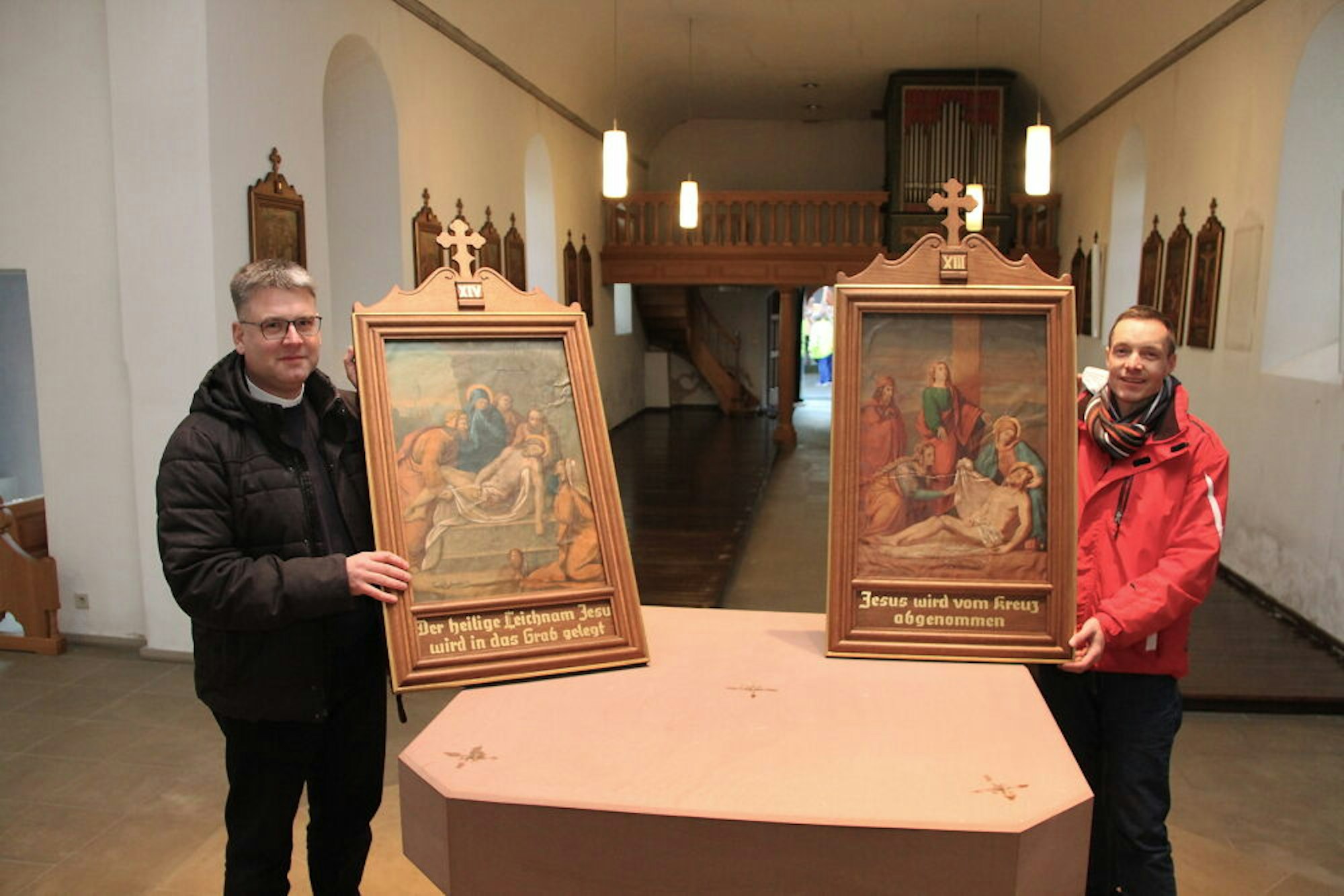 Die 14 Stationenbilder des Kreuzwegs bringen Pfarrer Andras Züll (l.) und Markus Koch zur Zwischenlagerung ins Pfarrheim.