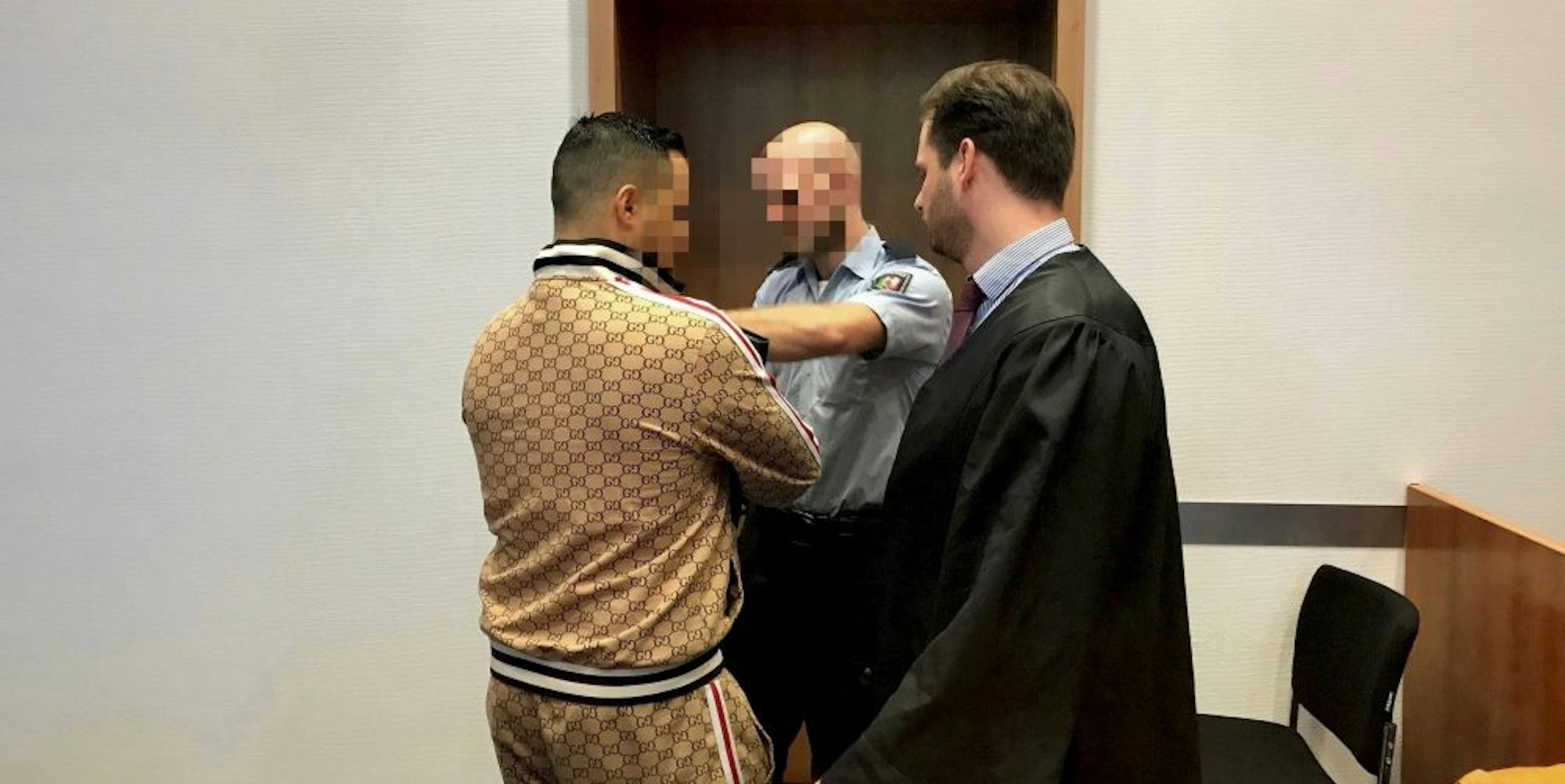 Im goldfarbenen Trainingsanzug und mit Handschellen kam der Angeklagte in den Sitzungssaal des Landgerichts.