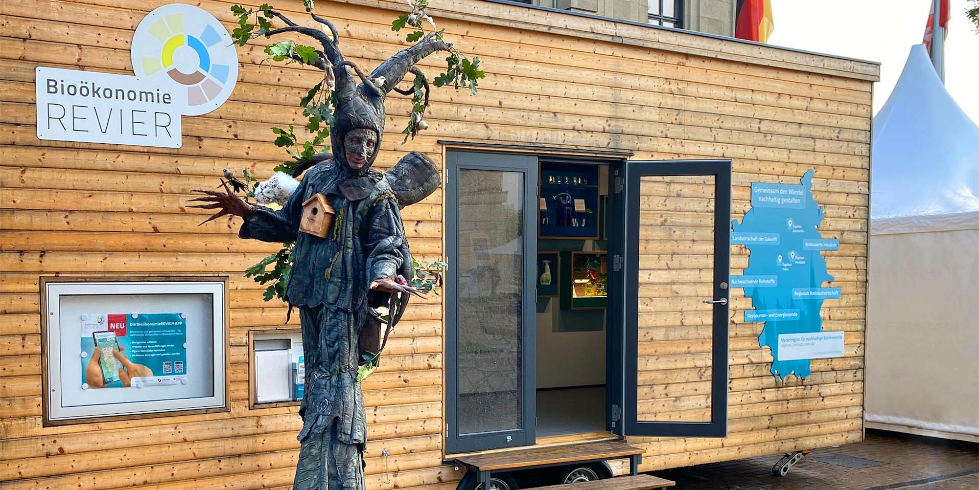 In einem mobilen Ausstellungsraum können Gäste sich über die Visionen für die Zukunft des Rheinischen Reviers informieren.