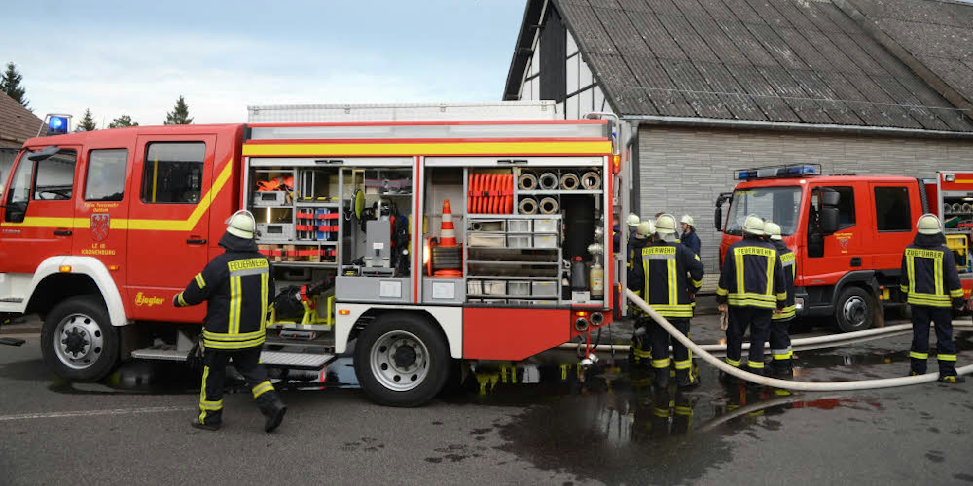 Mit rund 55 Kräften eilten die Wehrleute des Löschzugs 3 (Löschgruppen Berk, Baasem, Frauenkron und Kronenburg) um Einsatzleiter Winfried Warler zur Einsatzstelle. Auch die Besatzungen der Drehleitern aus Jünkerath und Schleiden , des Einsatzleitwagens aus Dahlem, zweier Rettungswagen und ein Notarzt wurden Richtung Berk in Marsch gesetzt.