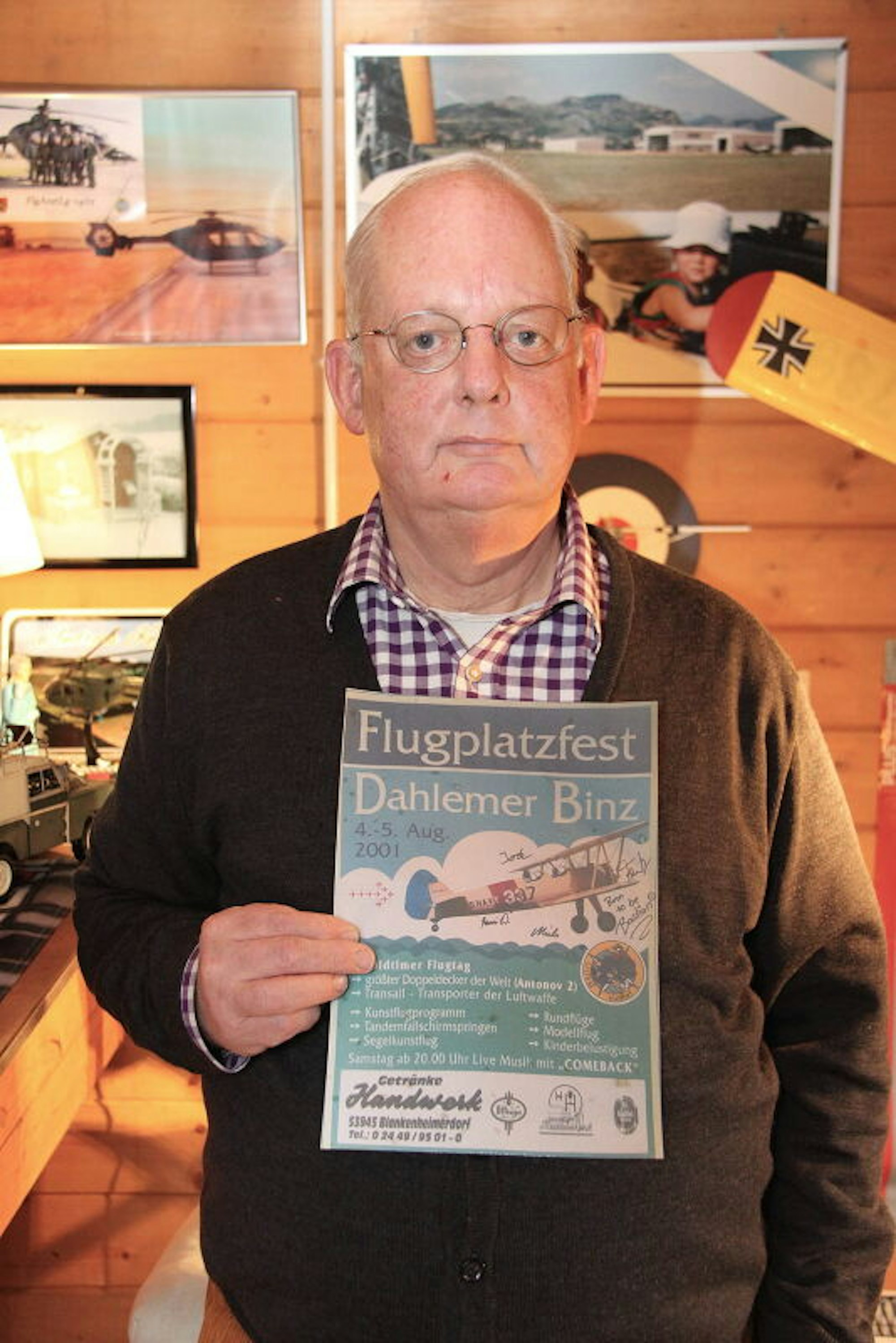 Andreas Knöffler, HNO-Arzt im Ruhestand und Oberstarzt d.R. (der Reserve) blickt versonnen auf ein Plakat an der Wand seiner Fliegerklause, des gemütlichen, mit Flugsportdevotionalien aller Art geschmückten Gartenhäuschens am Wohnhaus in Mülheim. „Das war der erste“, sagt der begeistere Hobbypilot, der ein Sportflugzeug auf der Binz stehen hat, über ein Plakatmotiv, das für den 2001 als ersten von vier von ihm organisierten Flugtagen auf der Binz warb.