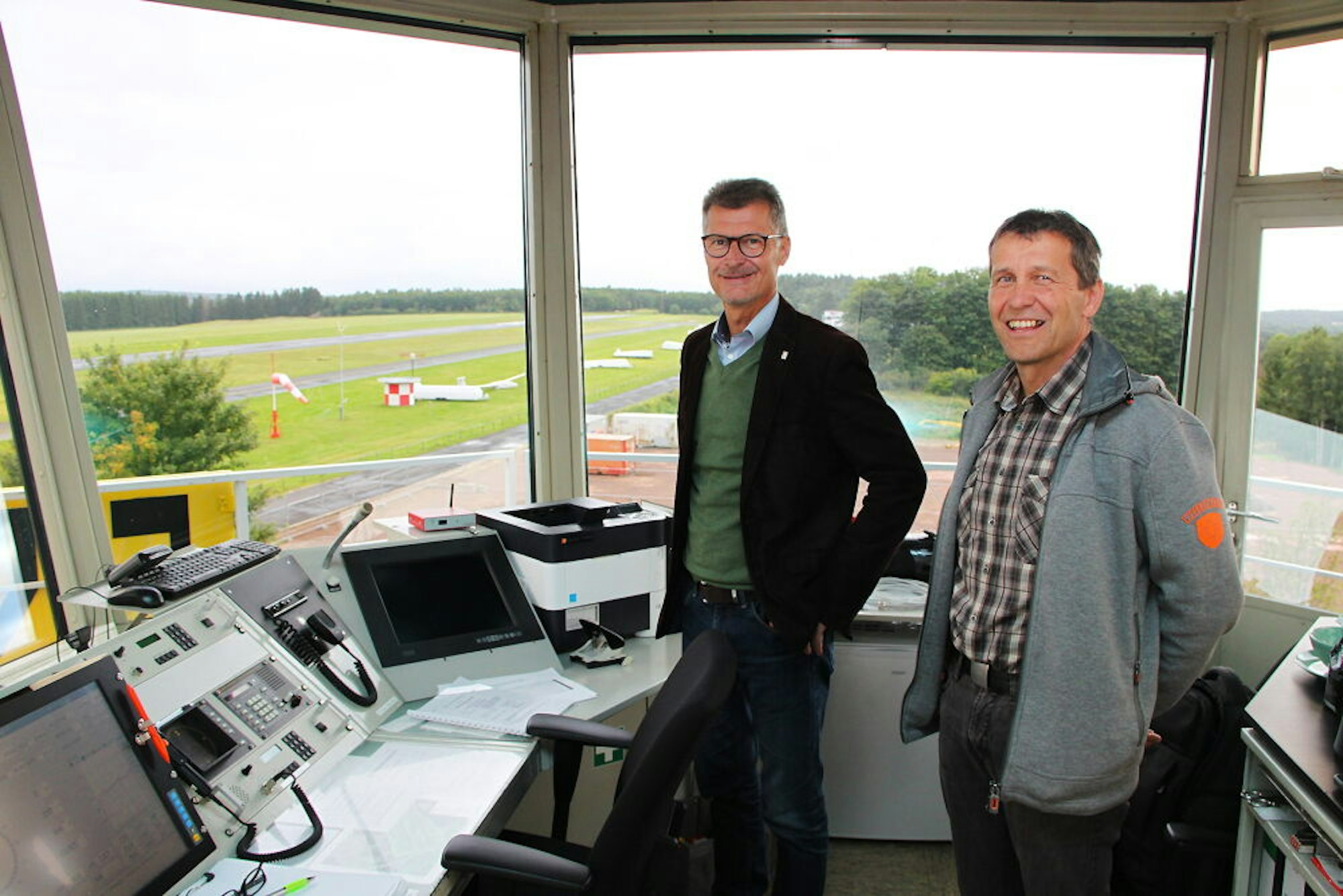 Können sich den Flugtag gut vorstellen: Bürgermeister Jan Lembach (l.) und sein Vertreter Erwin Bungartz, hier im Tower der Binz.