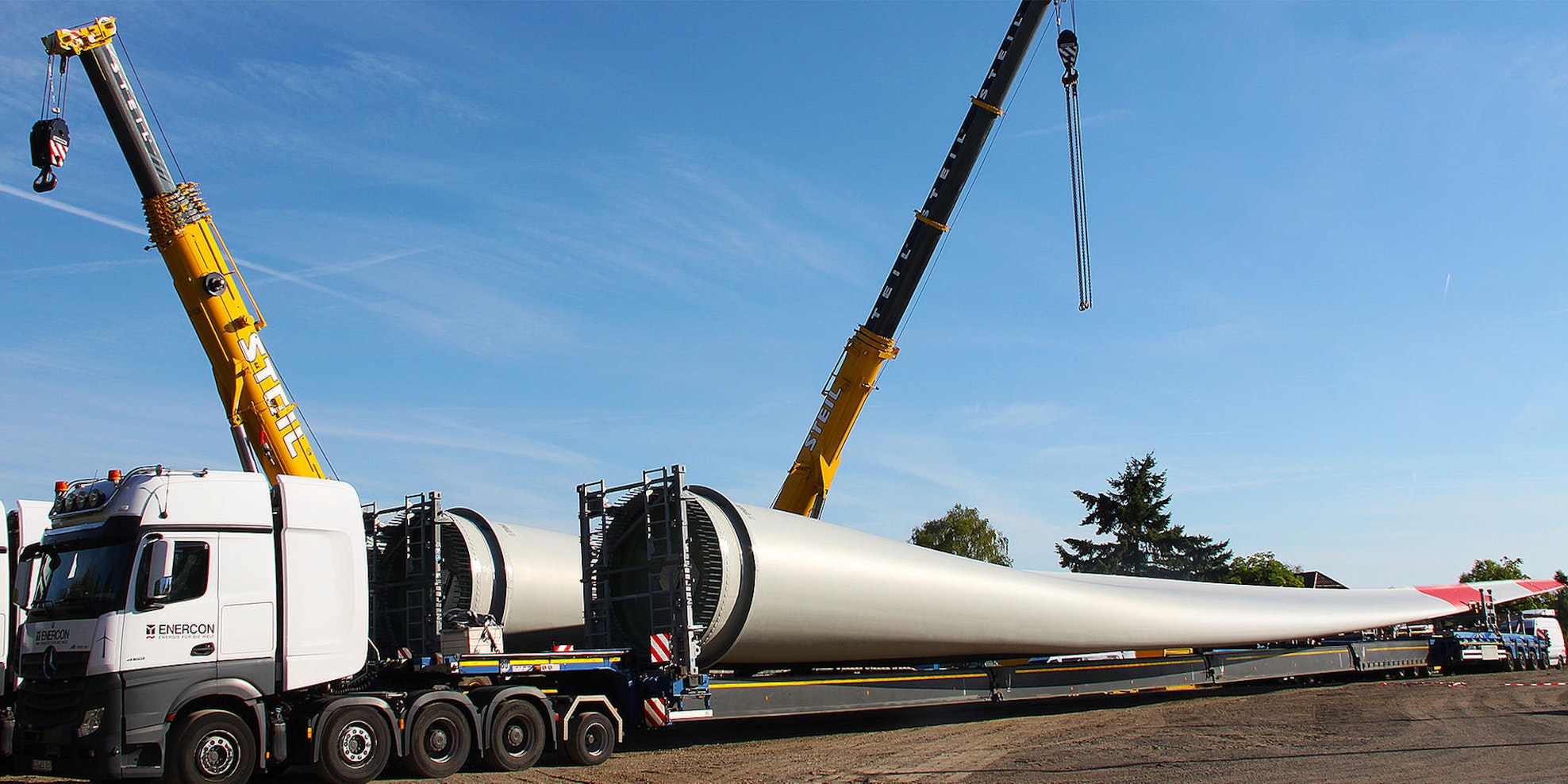 Das Abladen und der Rücktransport des leeren, dann von einer Zugmaschine gezogenen Selbstfahrers ist für Donnerstagvormittag vorgesehen. In rund zwei Wochen will man so alle sechs Blätter zu den beiden Windkrafttürmen gefahren haben, in sieben Kilometern Tiefe im Schmidtheimer Wald. Dort erfolgt zu einem späteren Zeitpunkt im Jahr die Montage an die beiden Naben.