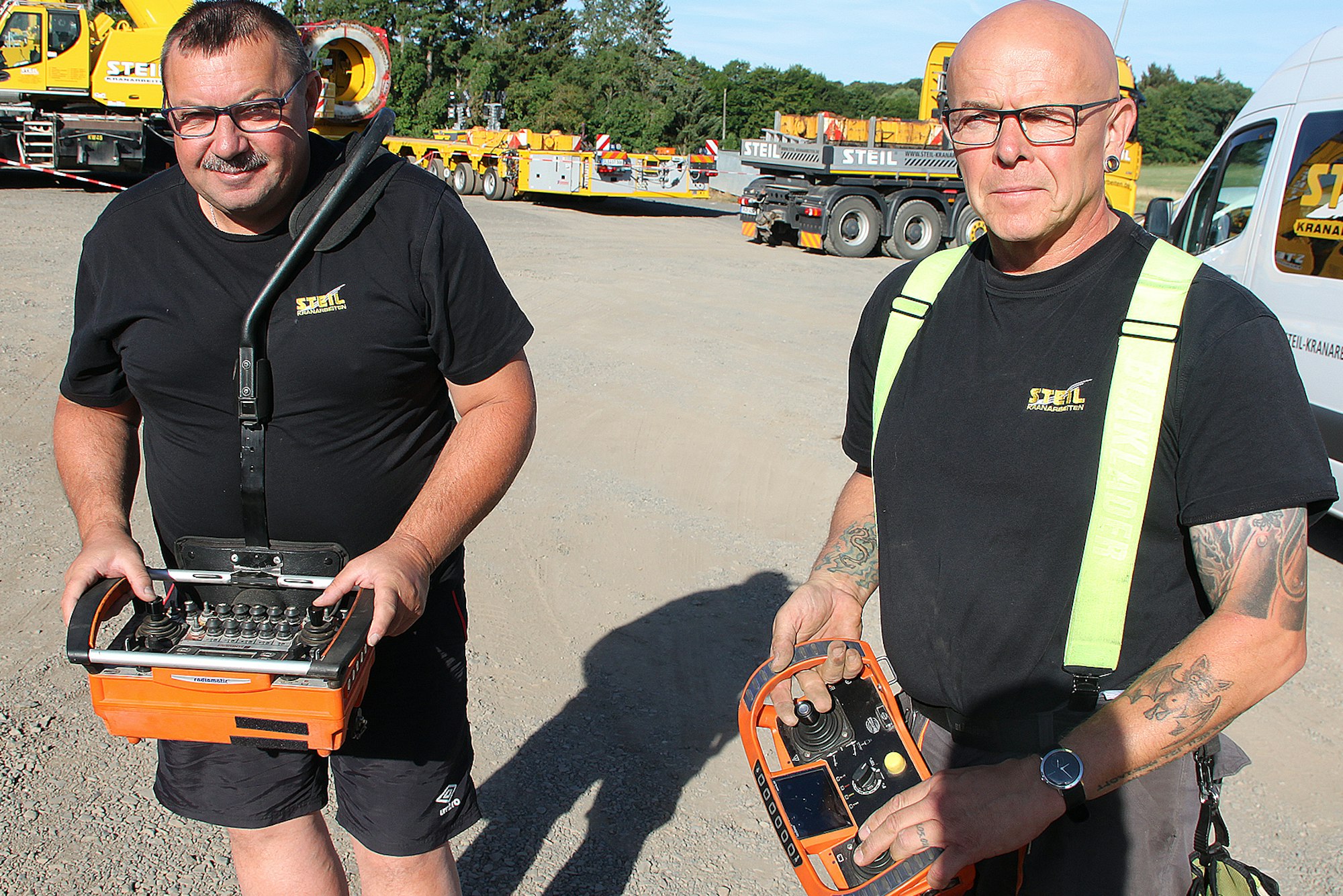 Am Mittwochvormittag steht Stein noch auf dem Parkplatz am Forstwalder Hof und greift sich eine große Fernsteuerung. Er hängt sich den Stützgurt über die Schulter. Was er in der Hand hält, ist keine kleine Fernsteuerung, wie sie Kinder für ihre bunten Flitzer lieben oder Fans des Modellflugzeugbaus nutzen. Die hier wirkt robuster und ist voll gepackt mit kleinen Anzeigen, Kipphebeln, Knöpfen und einem Joystick. Das ist die Steuerung, mit der Steins Chef und Teamleiter Daniel Schulz gegen 22 Uhr ein Monstrum in Bewegung setzen kann – wenn die Bedingungen stimmen und beispielsweise der Wind nicht zu stark ist.