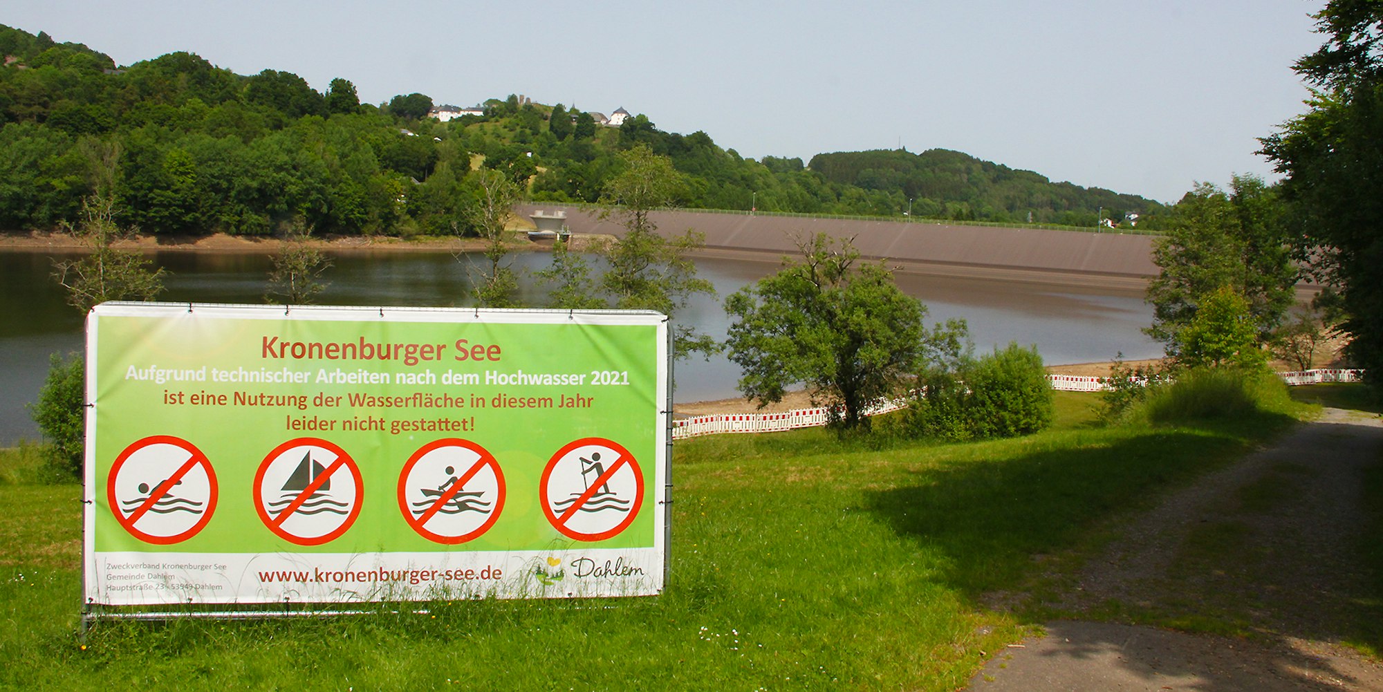 Dahlem-Kronenburg – Über 30 Grad am Wochenende. Das hält man nur drinnen bei geschlossenem Fenster und heruntergelassenen Rollladen oder Rollos aus – oder am Badesee. Der Kronenburger See kommt dafür in diesem Jahr allerdings nicht infrage. Alle Freizeitaktivitäten auf dem Wasser sind wegen der Reparaturen an der durch die Flut beschädigten Talsperrentechnik untersagt. Für die Arbeiten, die den Zweckverband Kronenburger See voraussichtlich mehr als eine Million Euro kosten, ist der See im niedrigen Winterstau.