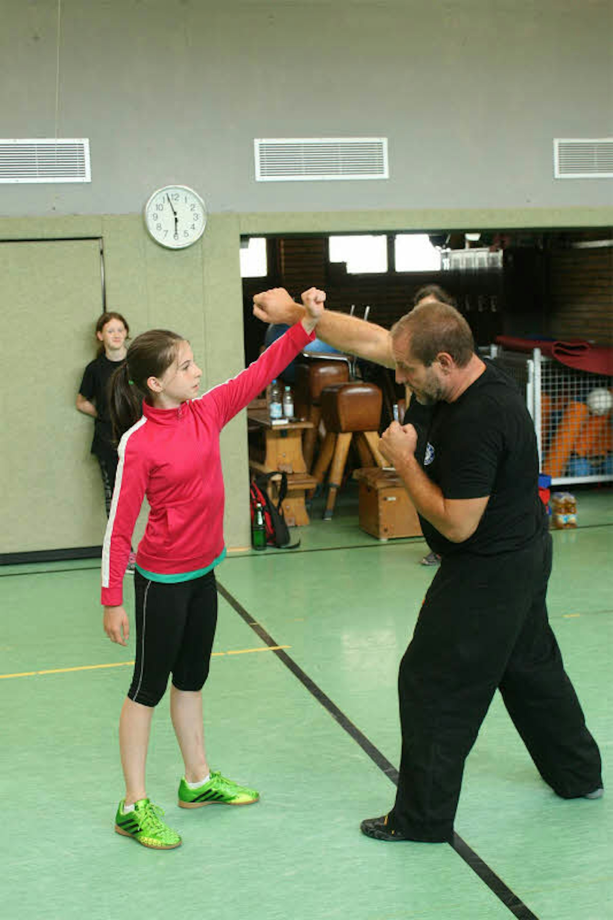 Ganz cool wehrt Marie-Sophie Schmitz den Angriff ab und blockt den Arm des Trainers.