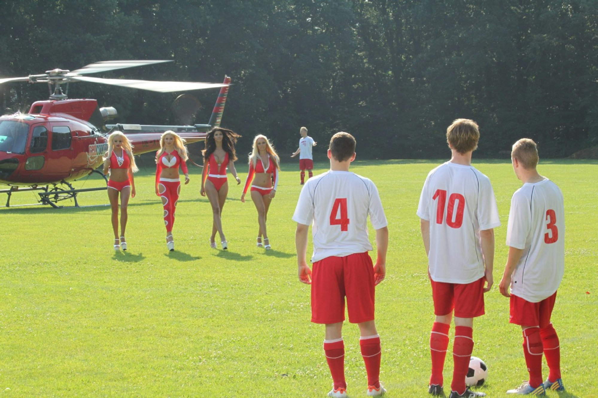 Die Fußballer bekommen große Augen, als die vier Damen aus dem Redcoon-Helikopter steigen.