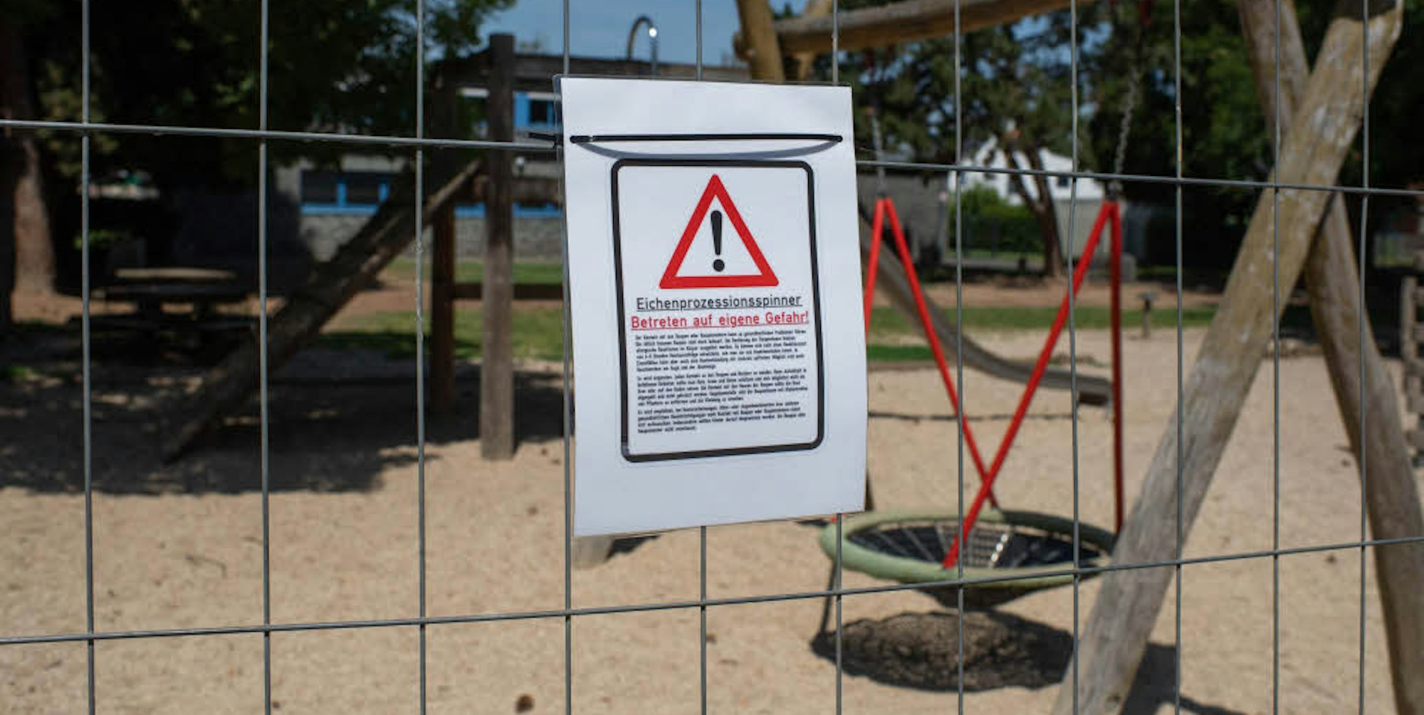 Euskirchen – Wer sich zurzeit auf dem Spielplatz an der Franziskusschule vergnügen will, hat schlechte Karten. Die Stadt hat das Areal auf dem Schulhof der Grundschule mit einem Zaun versehen und Warnhinweise aufgehängt. Aus gutem Grund, denn dort hat sich der Eichenprozessionsspinner an einer Eiche auf dem Spielplatz angesiedelt.
