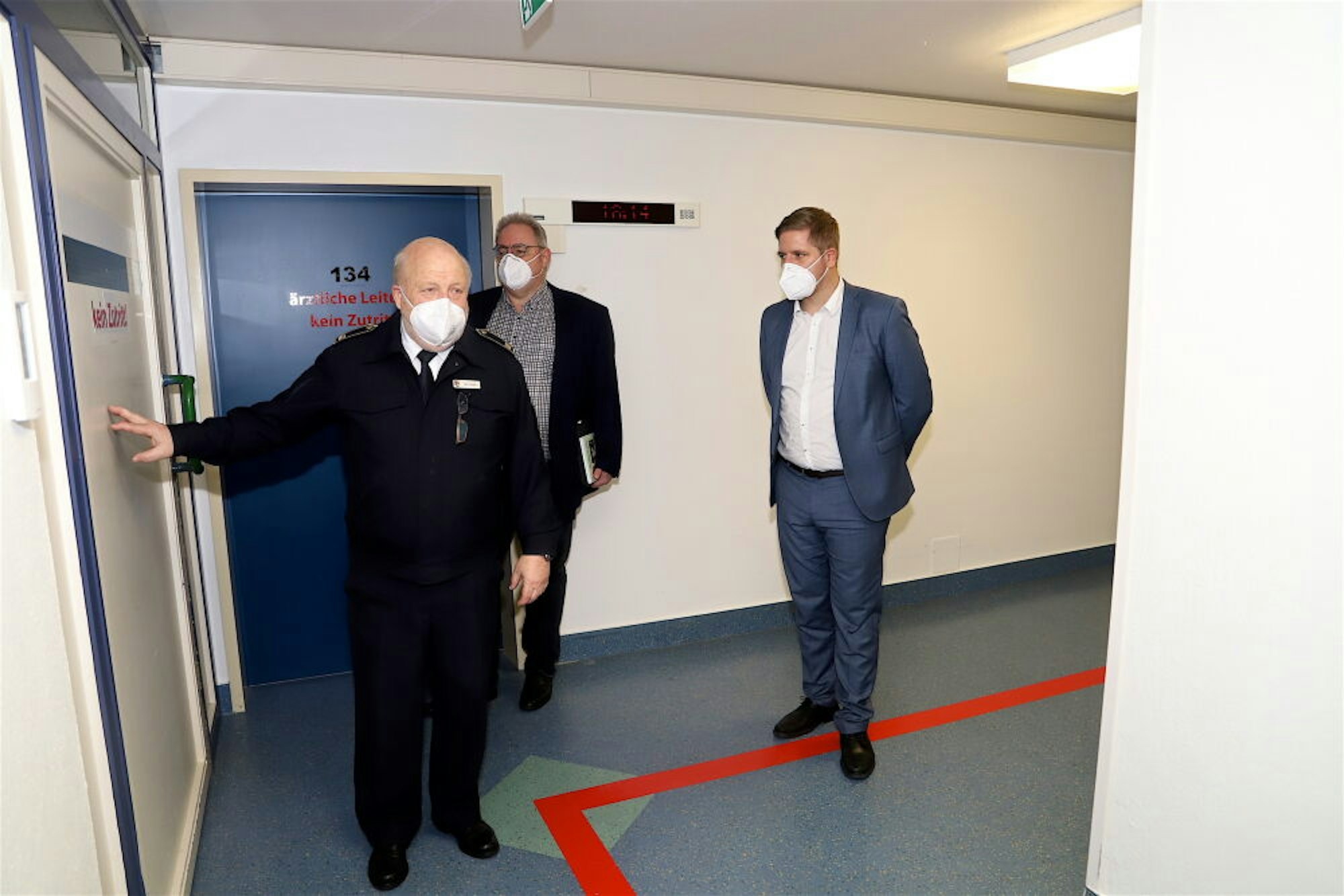 Beim Aufruf der gezogenen Nummer muss sich der Impfling in die erste Etage begeben. Dort folgt er einer roten Markierung auf dem Boden in die ehemaligen Patientenzimmer der Klinik. jetzt soll hier geimpft werden. Ist die Prozedur abgeschlossen, können die Impflinge eine halbe Stunde warten, um allergische Reaktionen auszuschließen.