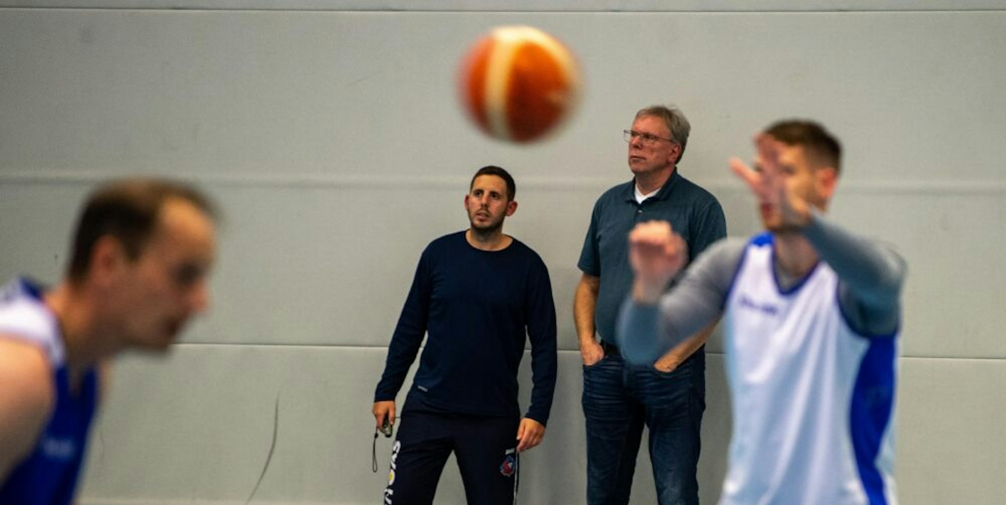 ErftBaskets-Trainer Philipp Sparwasser (l.) schaut beim Training vor dem Saisonauftakt genau hin.