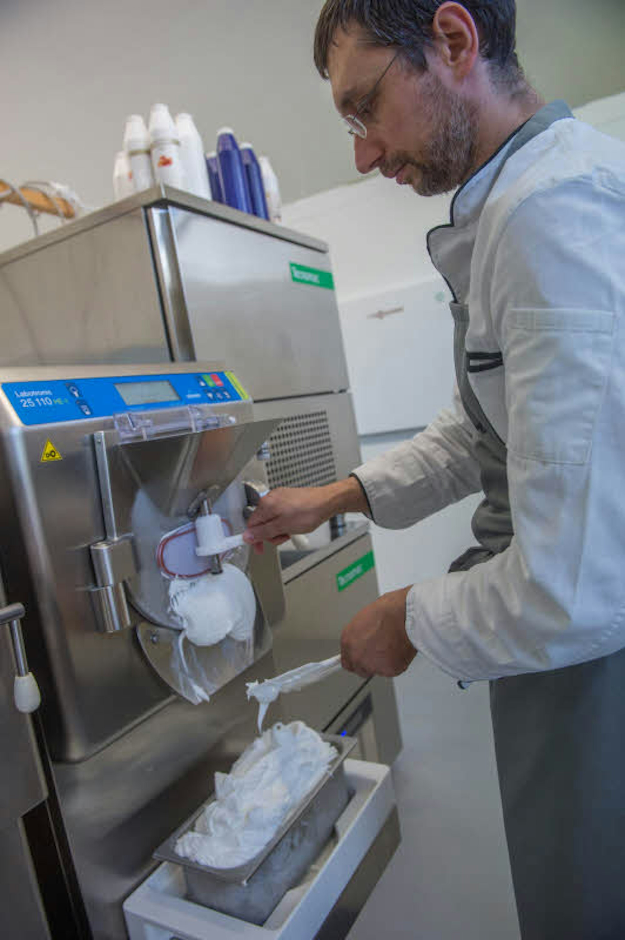 „Die unterschiedlichen Eissorten haben alle eine individuelle Zutatenliste. Mango-Eis braucht beispielsweise weniger Zucker als Zitrone, da die Mango genug Eigensüße mitbringt. Trotzdem müssen alle Sorten dieselben Schmelzeigenschaften haben, denn in der Kühltheke herrscht ja nur eine Temperatur. Das ist nicht einfach“, erklärt er.