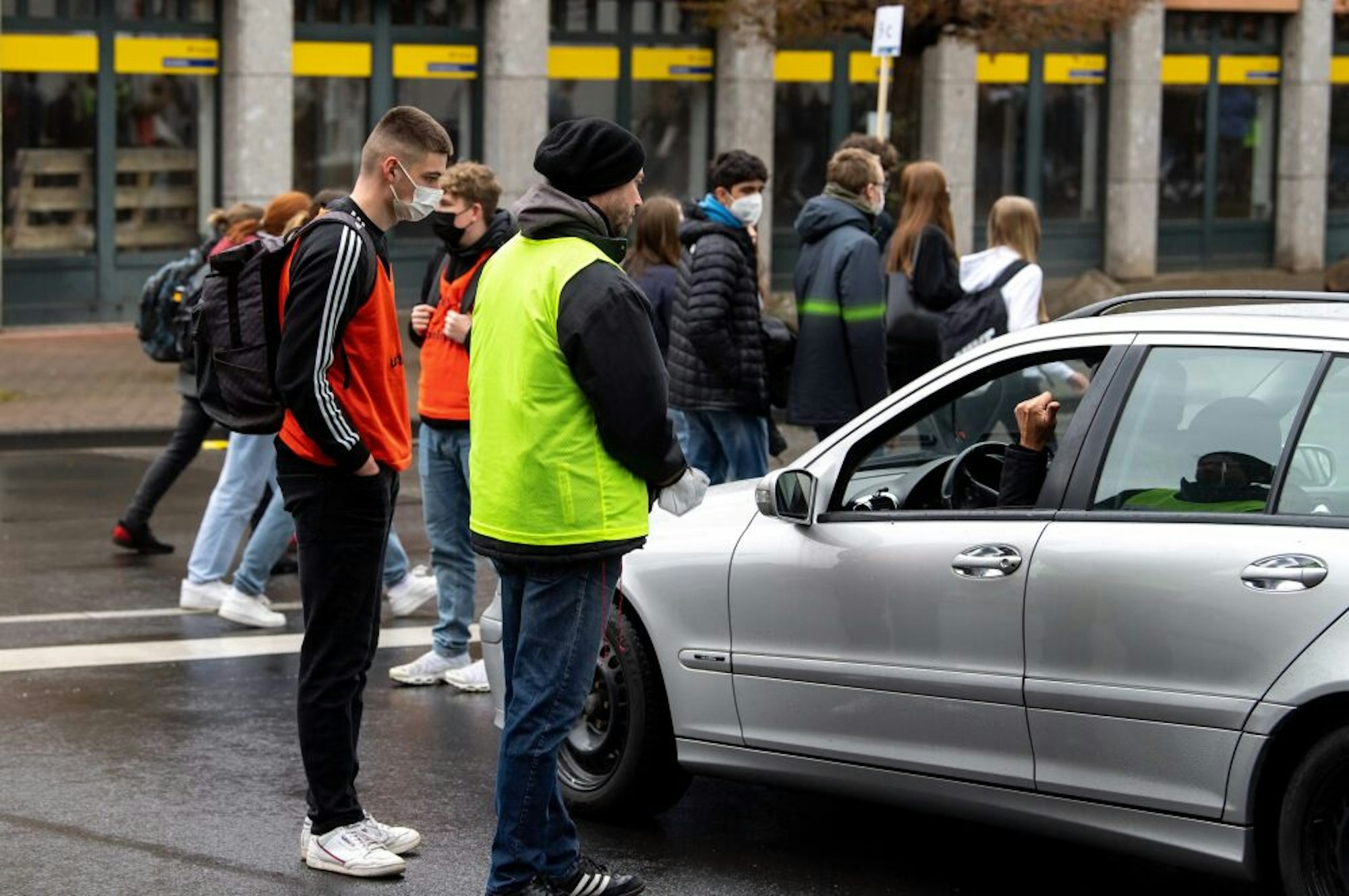 Nicht überall zeigten sich die Verkehrsteilnehmer mit der kurzen Beeinträchtigung einverstanden. An der Emil-Fischer-Straße beschwerte sich ein Autofahrer durchaus massiv darüber, dass er warten musste. So massiv, dass der Lehrer der Marienschule, der mithilfe einer Warnweste als Ordner gekennzeichnet war, das „Gespräch“ beendete und den Autofahrer an die Polizei verwies.
