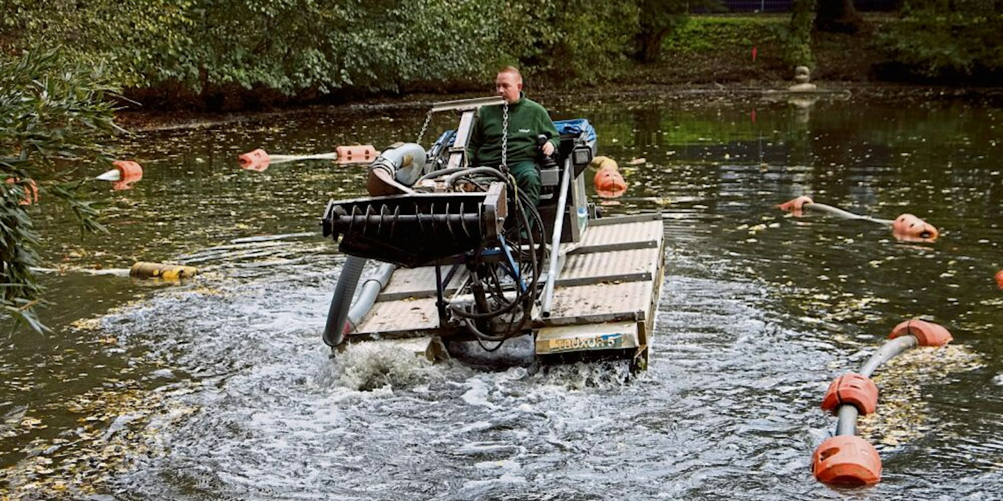 Der „Kapitän“ steuert das Amphibien-Fahrzeug durch den Schillerteich, um ihn zu entschlammen.