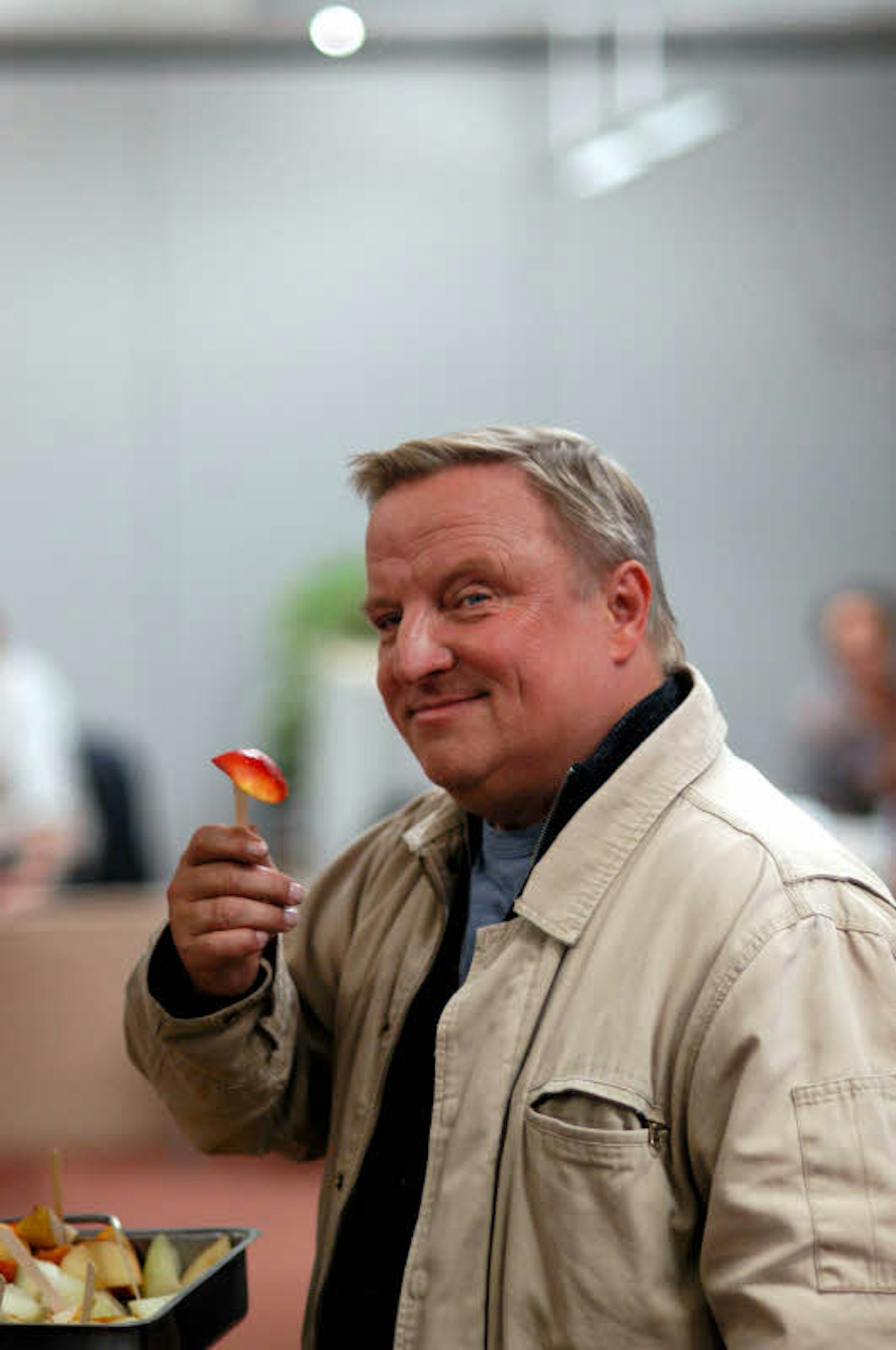 Für die Folge mit dem Arbeitstitel „Spieglein, Spieglein“ sind 23 Drehtage angesetzt. „Wir sind jetzt, glaube ich, bei Tag 13“, sagt Prahl, während er sich an einer Platte mit Obst bedient, das für die Akteure in dem aufgeheizten Raum eine willkommene Erfrischung darstellt. „Die Kreisverwaltung unterstützt uns sehr gut“, erzählt Produktionsleiter Krahnert. „Wir haben uns hier von Anfang an sehr willkommen gefühlt.“ Die Szenen in der Zulassungsstelle werden erst nach Dienstschluss der Kreismitarbeiter gedreht, so Krahnert: „Wir wollen ja den Publikumsverkehr nicht stören.“