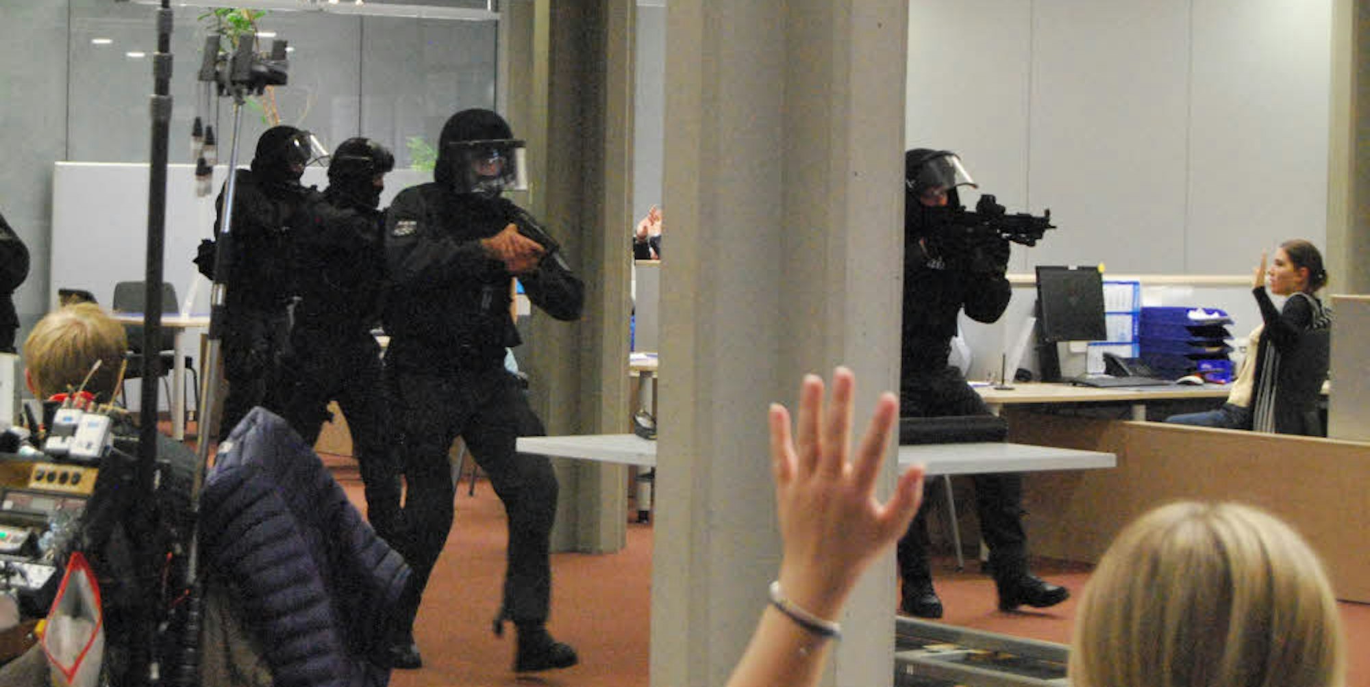 Alles nur gespielt: Kunden und Mitarbeiter der Kfz-Zulassungsstelle reißen die Arme hoch, als eine SEK-Einheit den Raum stürmt.