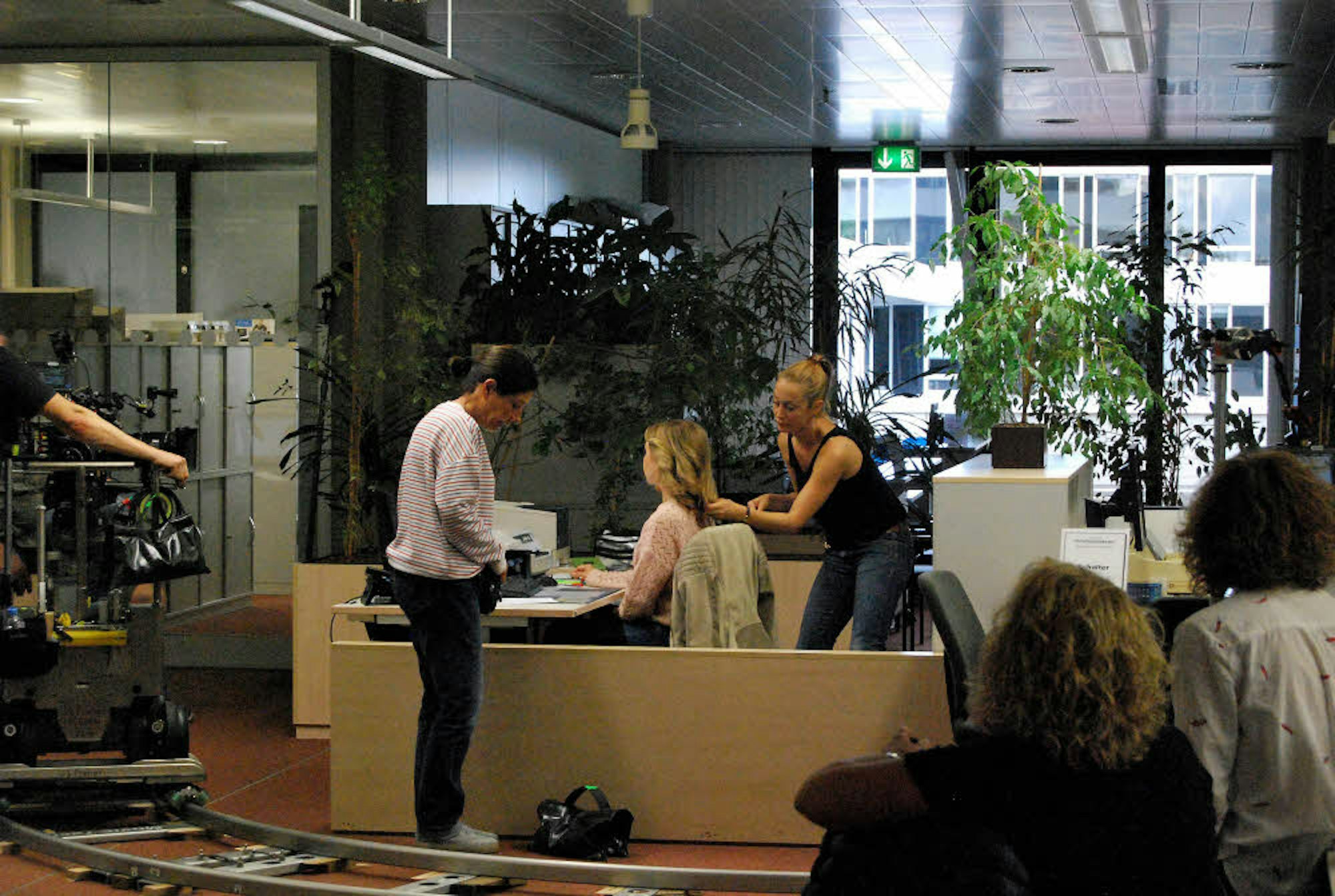 Die Kfz-Zulassungsstelle diente einen halben Tag lang als Filmset. Hier kümmert sich eine Maskenbildnerin um eine der Akteurinnen.