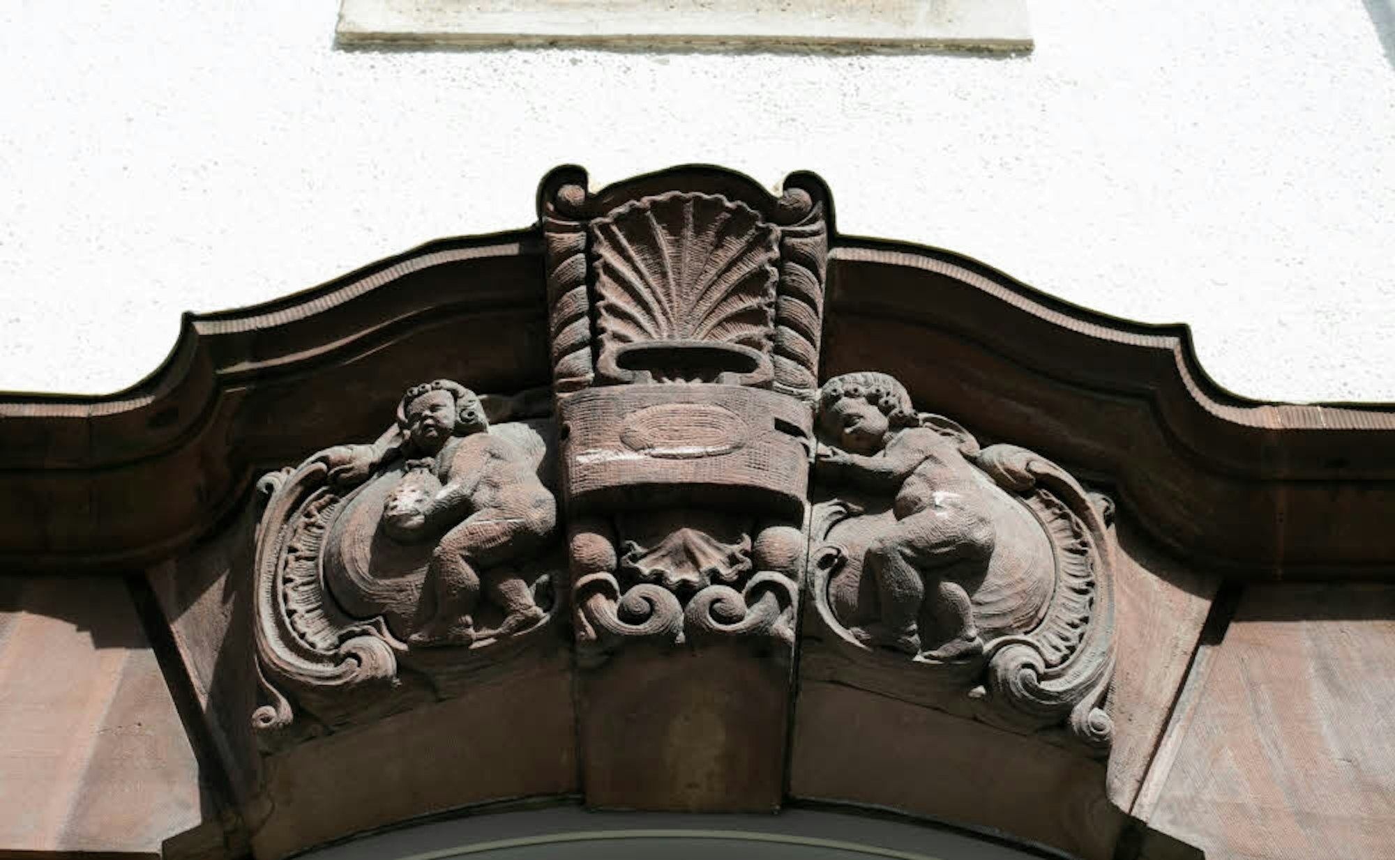 Zwei Putten stellen dabei eine typische Sparszene dar: Die rechte steckt einen Groschen in die „Sparkasse“, die andere Figur trägt einen Sack Geld weg. Ob es sich hier um die ersparten Zinsen handelt, bleibt ein Rätsel. (the)