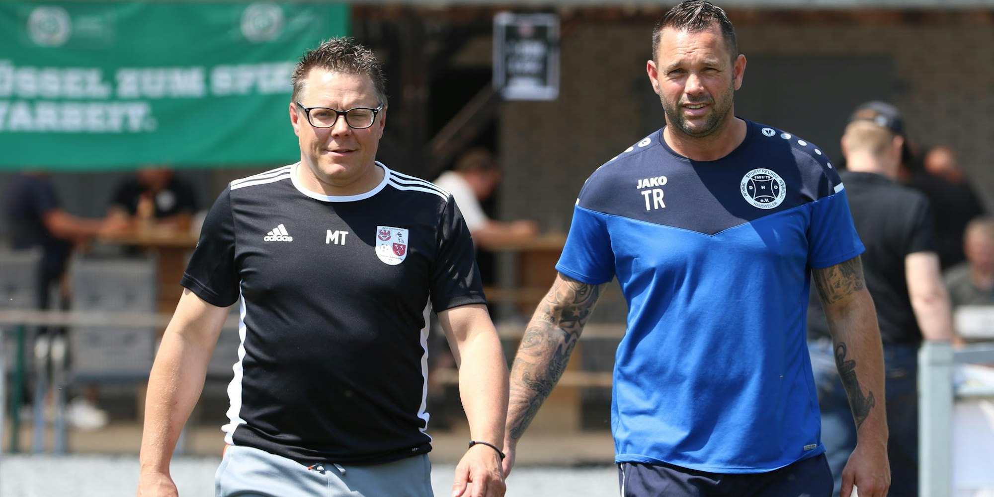 Wiedersehen in der Kreisliga A: Die Trainer Marcel Timm (l., Dahlem) und Gerrit Ueckert (DHO) beim Entscheidungsspiel.