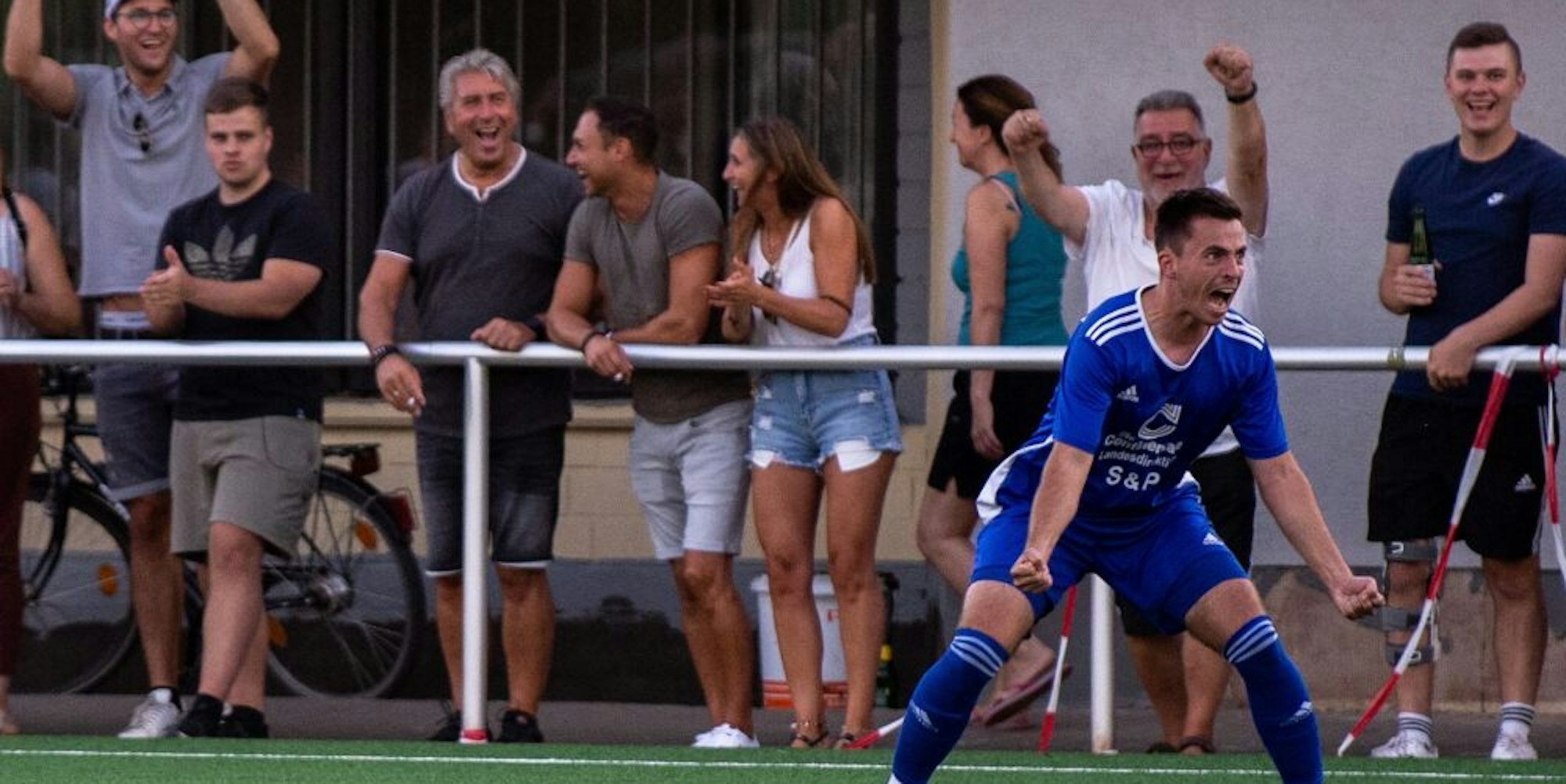 Emotionen pur: Weilerswists Sven Stanienda bejubelt sich, seinen Freistoß und die kurzzeitige Führung des SSV gegen Erftstadt.