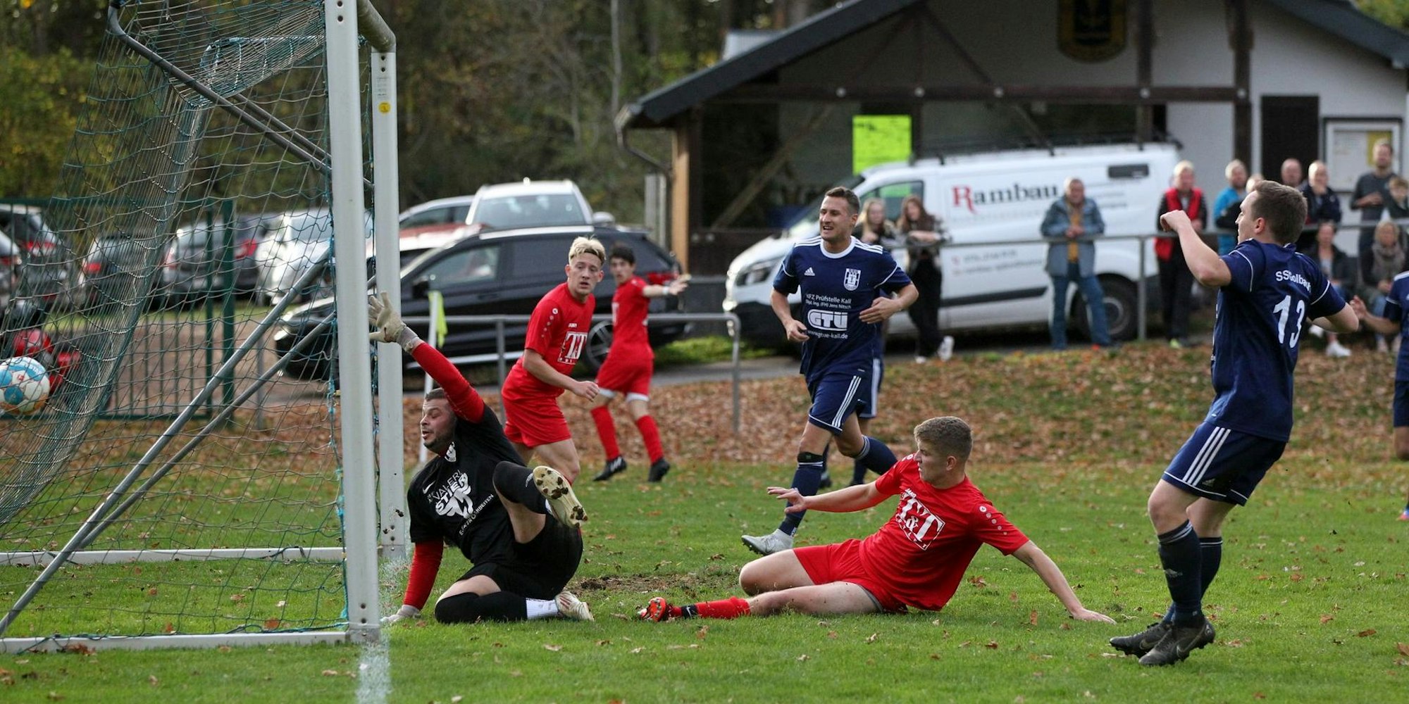 Rums und drin: In dieser Szene erzielte Erfts Yannick Frings die 1:0-Führung. Golbachs Keeper Nico Pütz blieb chancenlos.