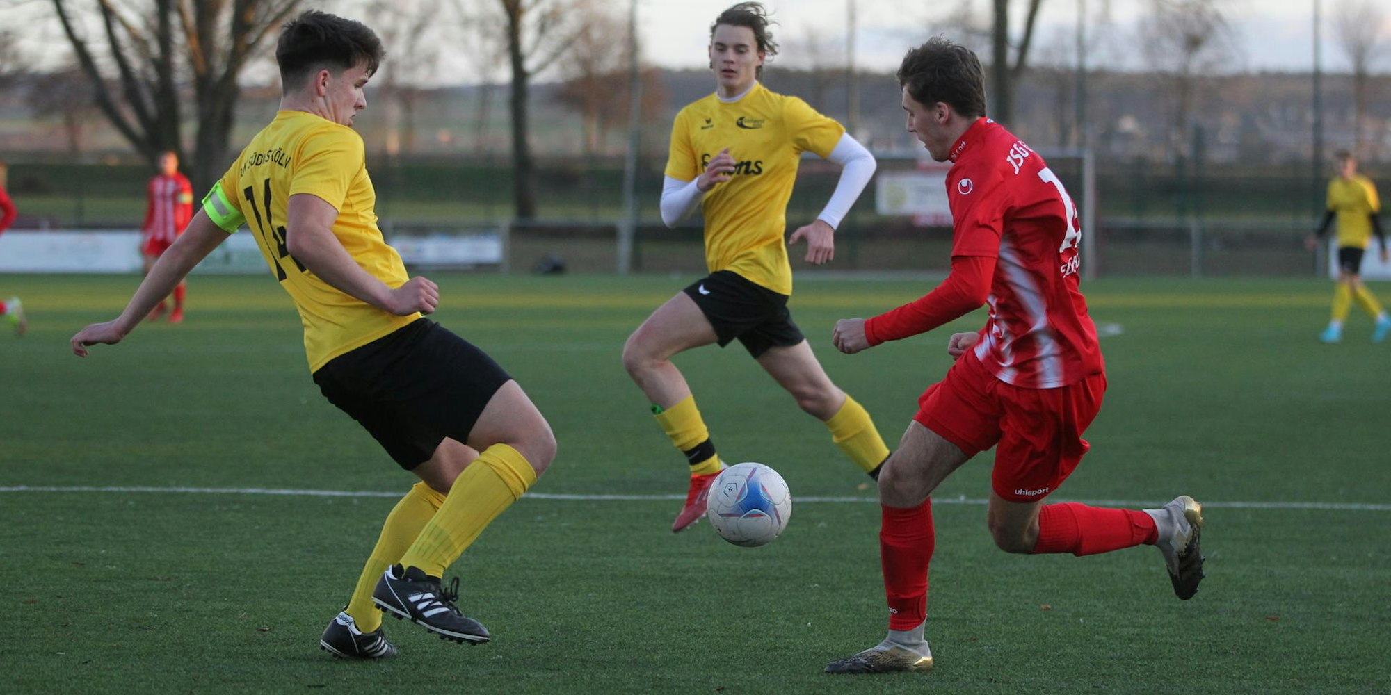 JSG Erft 01 – DJK Südwest Köln 3:1 (1:0). Zu Hause ist die Mannschaft von Trainer Senaid Begic einfach nicht zu schlagen. Die A-Junioren feierten einen verdienten Heimsieg, die Zuschauer sahen gut herausgespielte und stark kombinierte Tore. Der frühe Führungstreffer gelang nach zehn Minuten Jörg Jogwer. Durch Unaufmerksamkeiten und schlechtes Ballspiel blieb die Spielentscheidung im ersten Durchgang allerdings aus. Im Gegenteil: Die Kölner Gäste blieben dadurch im Match, auch wenn es bis zur 51. Minute dauerte, bevor de Marco der Ausgleich gelang.
