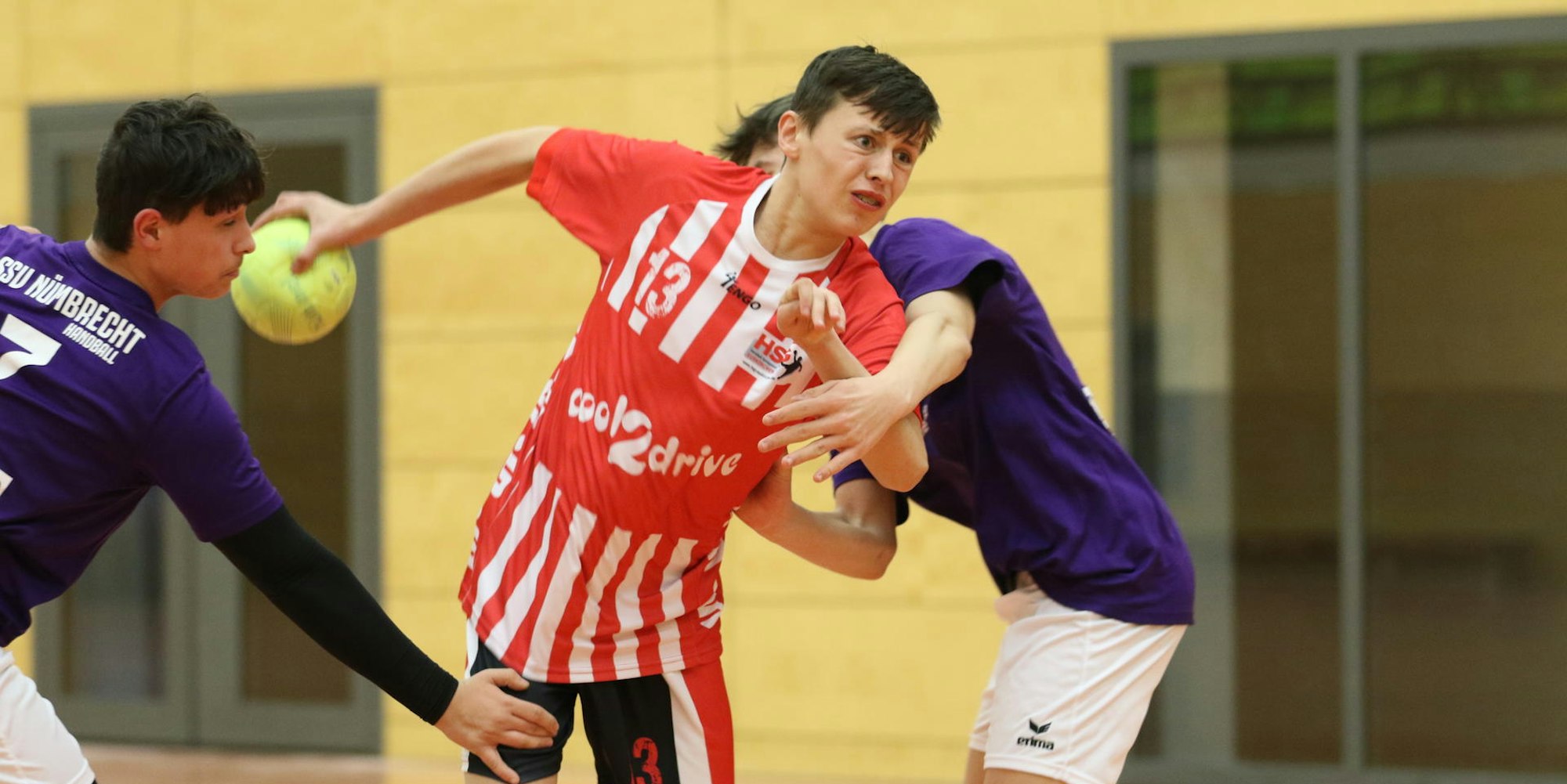 Mit viel Willen setzt sich HSG-Nachwuchshandballer Tim Speichert gegen zwei Gegenspieler durch. Ihm gelingen beim Heimsieg insgesamt drei Treffer – davon ein Siebenmeter.