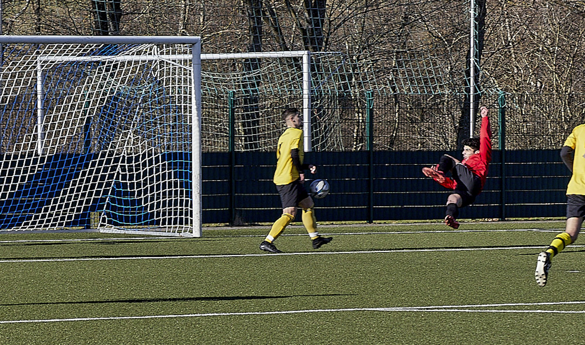 Mit einem Seitfallzieher schoss Silvio Ferjani von der JSG Zwanzig 18 auf das Schlebuscher Tor.