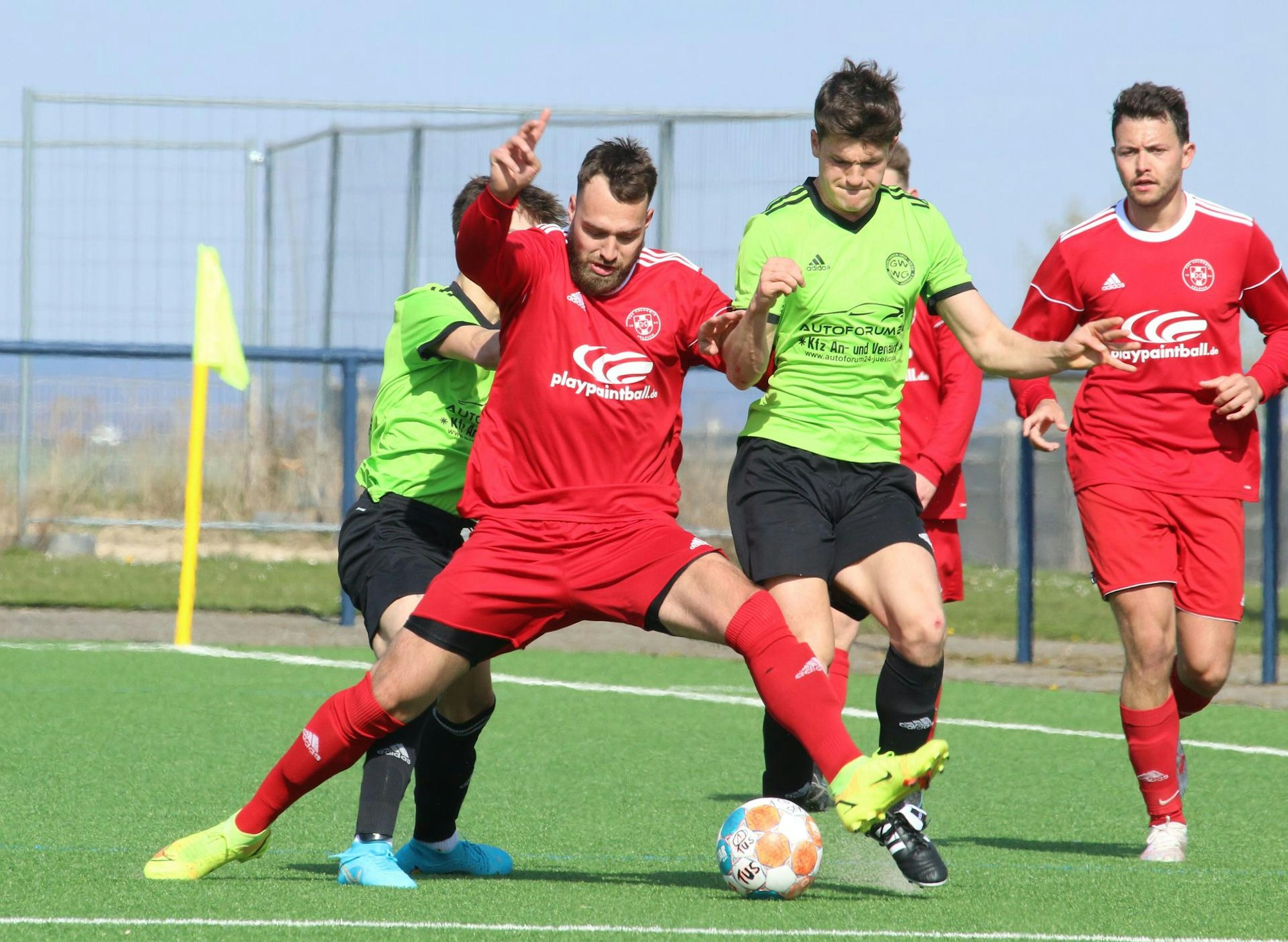 Die Gastgeber hatten danach große Mühe, Struktur in ihre Offensivaktionen zu bekommen und verloren phasenweise schnell den gerade gewonnenen Ball. Erst spät im ersten Abschnitt gelang der sehenswerte Ausgleich, als Thomas Leßenich lang und diagonal auf Dustin Oellers passte, der Kapitän per Kopf querlegte und David Sasse aus kurzer Entfernung vollstreckte (36.). Ein noch leicht abgefälschter Schuss von Leßenich ans Aluminium hätte mit dem Pausenpfiff beinahe sogar für das 2:1 gesorgt.
