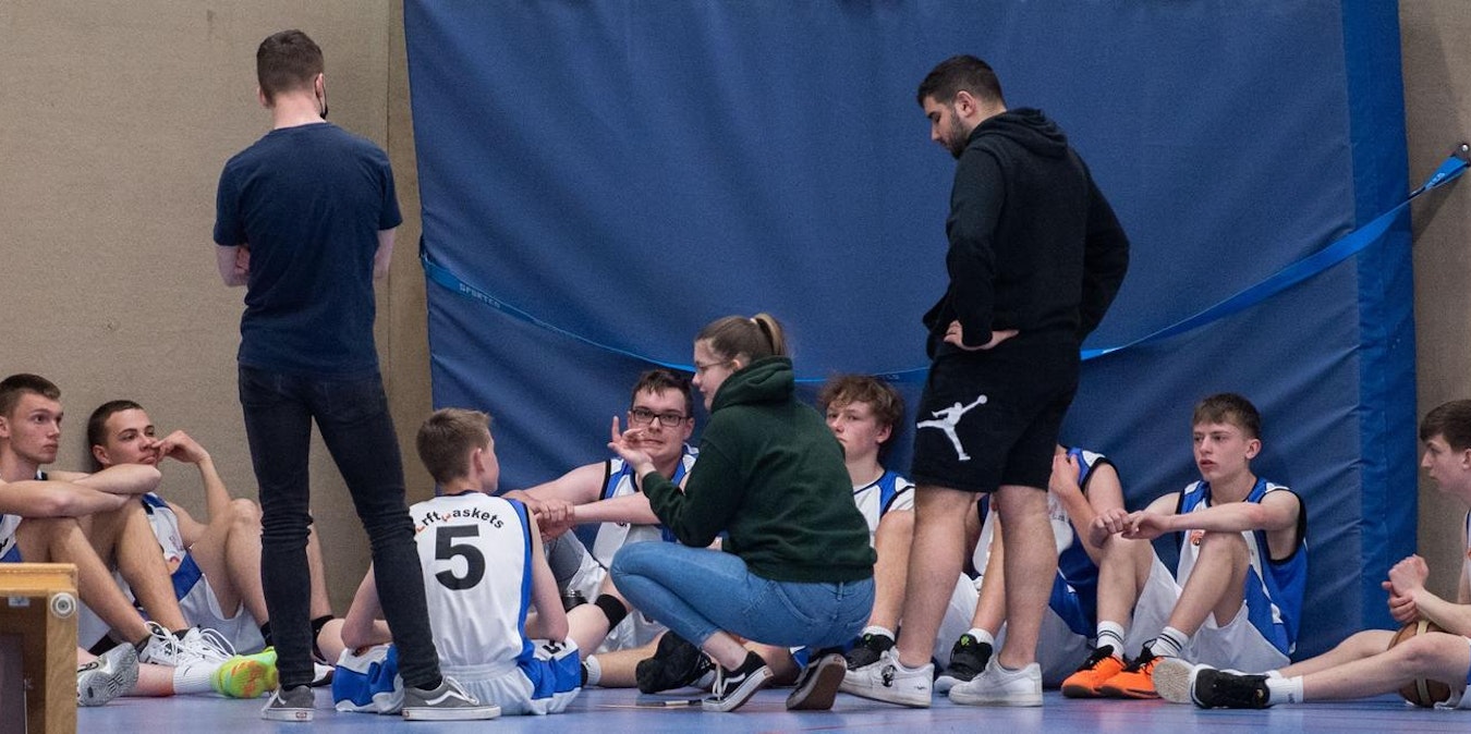 Hören aufmerksam zu: Die jungen ErftBaskets bei der Halbzeitansprache von Co-Trainerin Maya Haest.