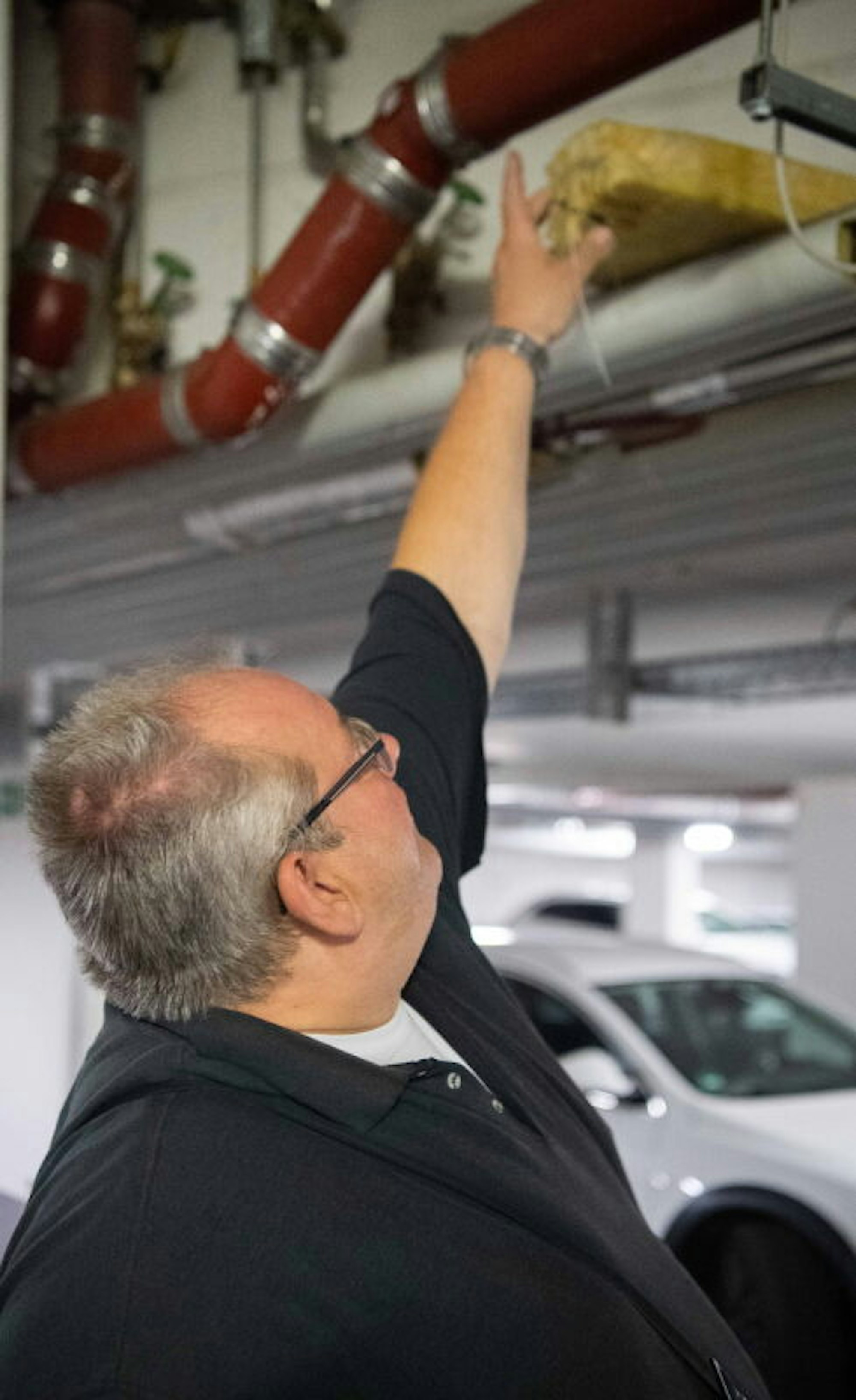 Wer sich die Treppenstufen etwas genauer anschaut, wird vor allem im unteren Bereich zahlreiche schwarze Flecken entdecken. Laut Stammel sind das Blutflecken. „Wenn wir das Treppenhaus mit einem Hochdruckreiniger bearbeiten, müssten wir das eigentlich im Schutzanzug tun, um die Ansteckungsgefahr zu minimieren“, sagt der Hausmeister, während er auf ein Leitungsrohr an der Decke der Tiefgarage zeigt. Bei dem fehlt die Isolierung. Die Aluminiumfolie, so Stammel, wird von Junkies abgepiddelt, um darin ihre Drogen aufzukochen.