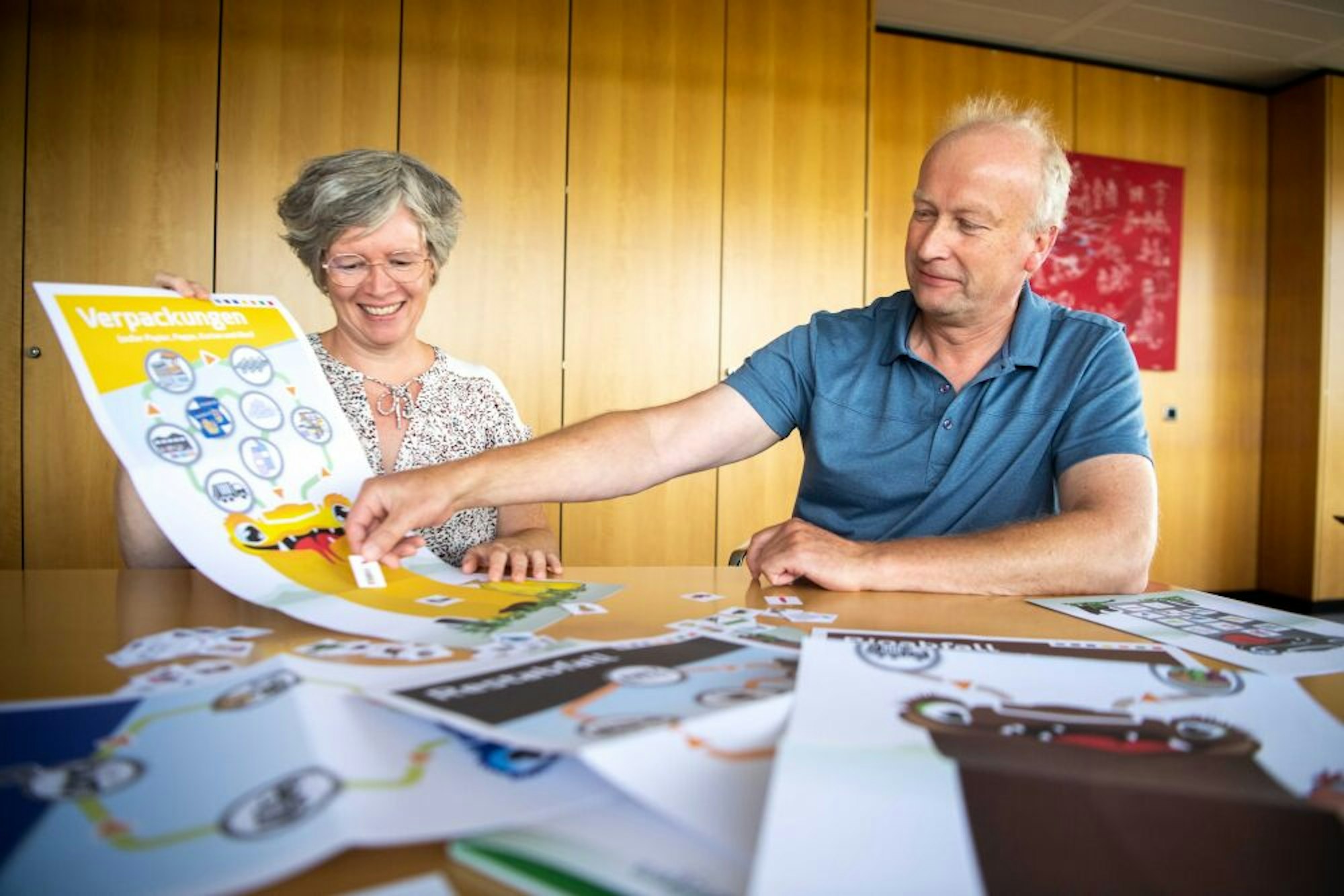 Mülltrennung ist kinderleicht: Karen Beuke und Karl-Heinz Latschitzki stellen Sortierposter für richtige Abfalltrennung vor.