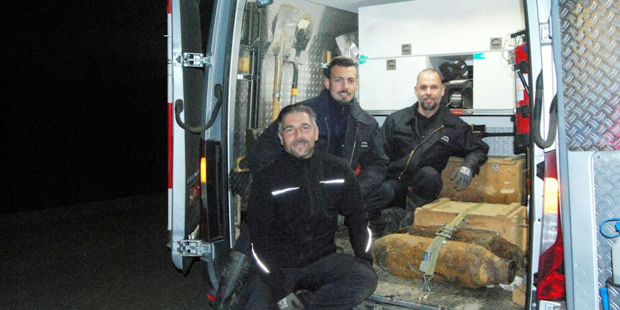 Die Experten der Kampfmittelbeseitigung mit den beiden entschärften 50-Kilo-Bomben. Anders als bei der großen Fliegerbombe hatten sie die deren Zünder entfernen können.