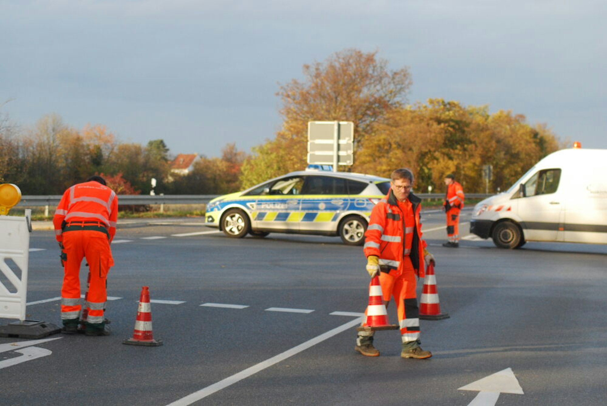 Mitarbeiter der Stadt und des Landesbetriebs Straßen NRW bauten Sperren auf, hier am Abzweig nach Weidesheim.