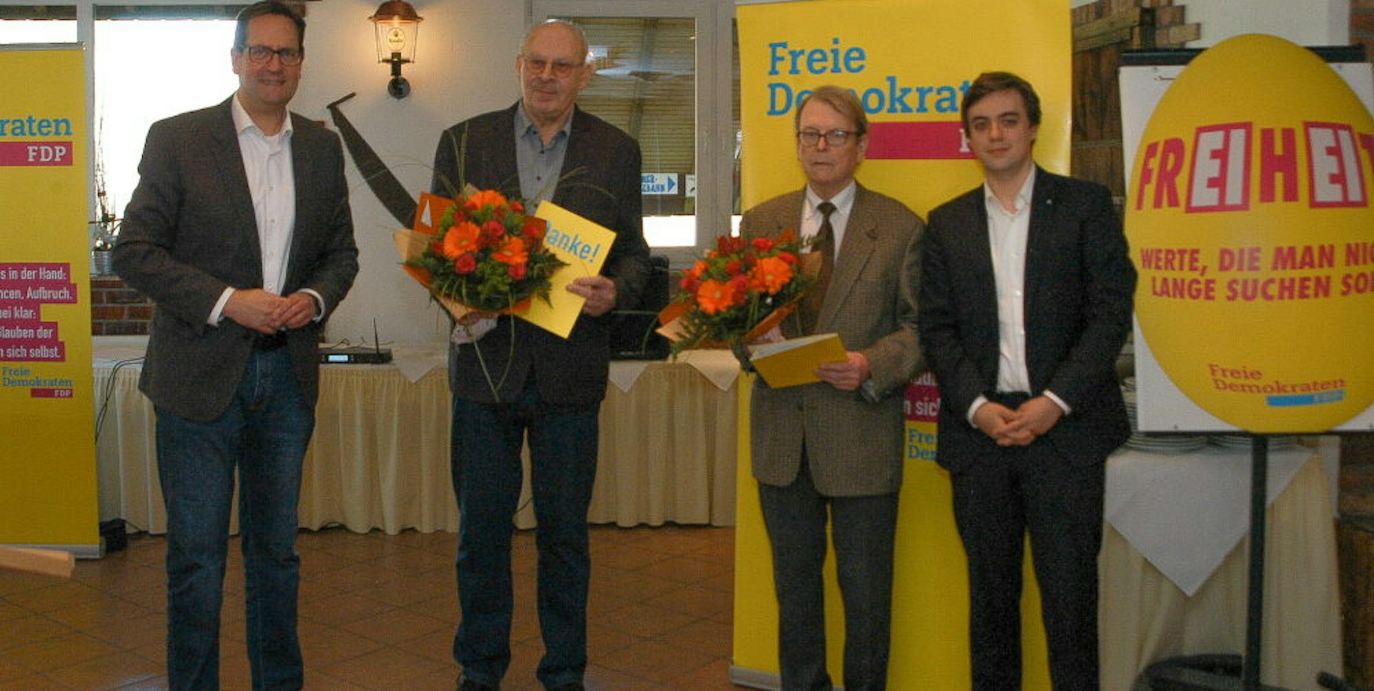 Den Rahmen ihres Kreisparteitages nutzten die Liberalen auch, um verdiente, langjährige Mitglieder auszuzeichnen. Für seine 40-jährige Mitgliedschaft in der FDP wurde Josef Kleine-Hegermann aus Zülpich geehrt, und auf 50 Jahre Mitgliedschaft bei den Liberalen blickt Heinz Schmitz aus Bad Münstereifel zurück. (eva)