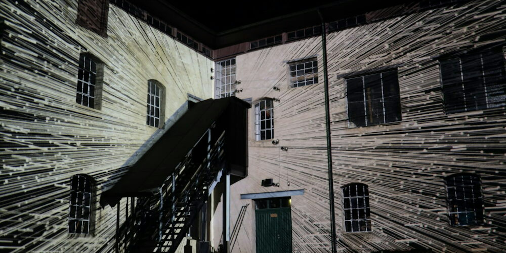 Euskirchen-Kuchenheim – Linien ziehen über die Fassade des Innenhofs der Tuchfabrik Müller. Ein Klang wie von Webstühlen nimmt den Zuschauer hinein in die Welt der Textilfabrikation. Verschiedene Sequenzen von Lichtbewegungen abstrahieren den Produktionsweg von der Faser bis zum Tuch.